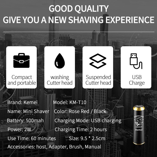 KEMEI KM-T10 Mini Men Electric Shaver Wet and Dry Use USB Rechargeable Portable Shaving Machine for Travel Business Trip