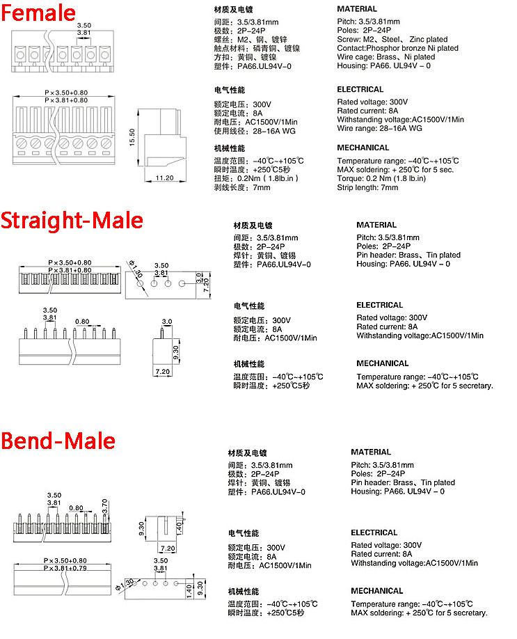 KF2EDG 3.81mm Connector 15EDG-3.81 2/3/4/5/6/7/8/9/10/11/12P PCB Pitch Universal Plug-pin Screw Green Terminal Block Connector Female/Straight/Bend needle Pin Male