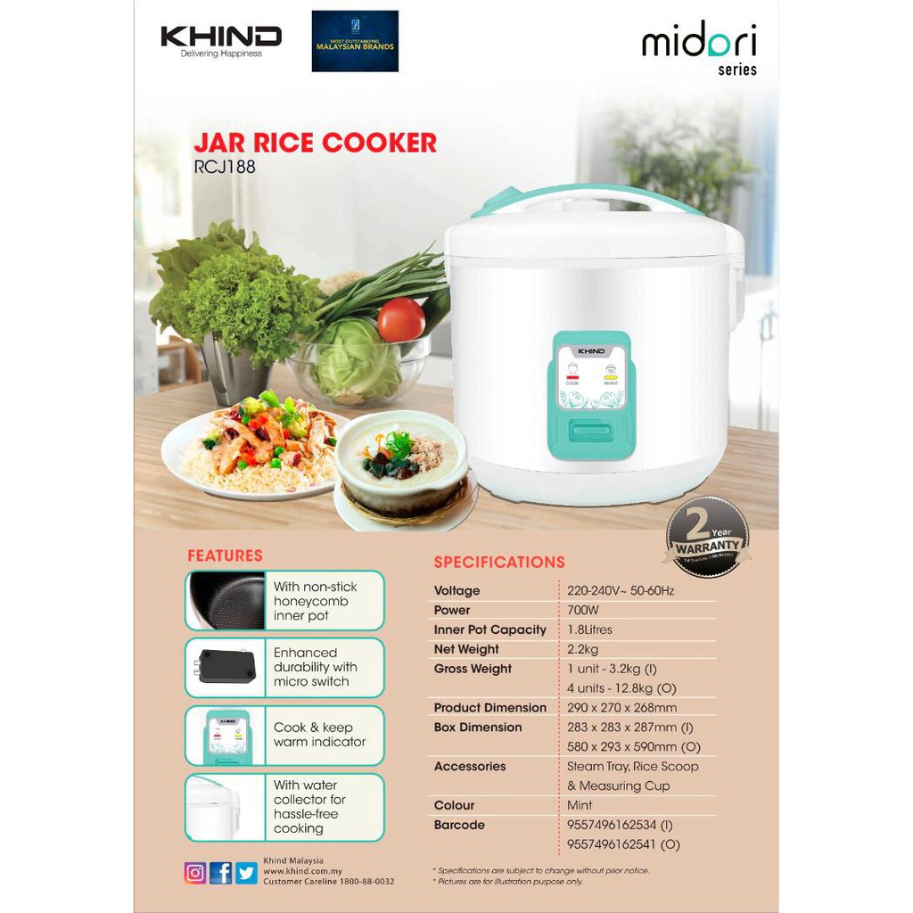 KHIND 1.8L Jar Rice Cooker with Steam Tray RCJ188 (White)
