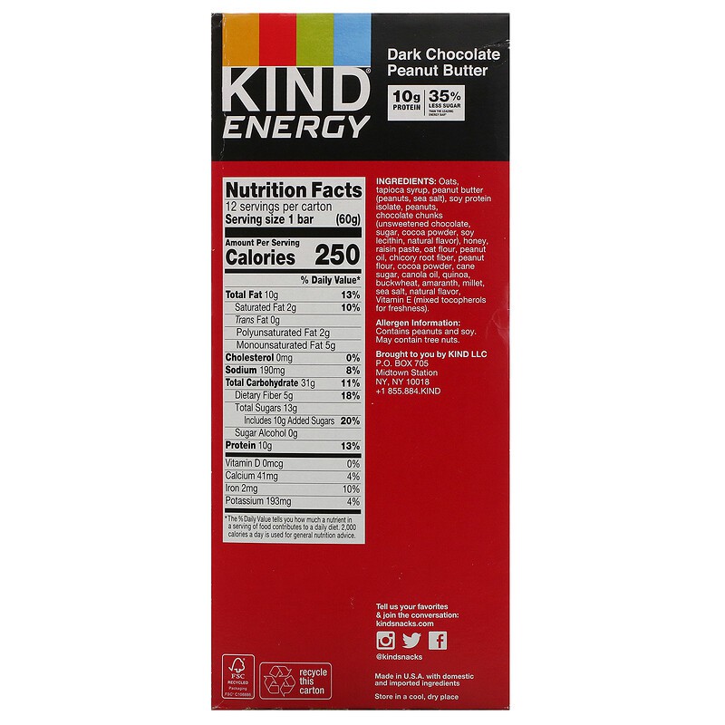 KIND Bars Energy 12 Bars x 60g Dark Chocolate Peanut Butter - Gluten Free & High Protein Fiber Ease Digestion & Boost