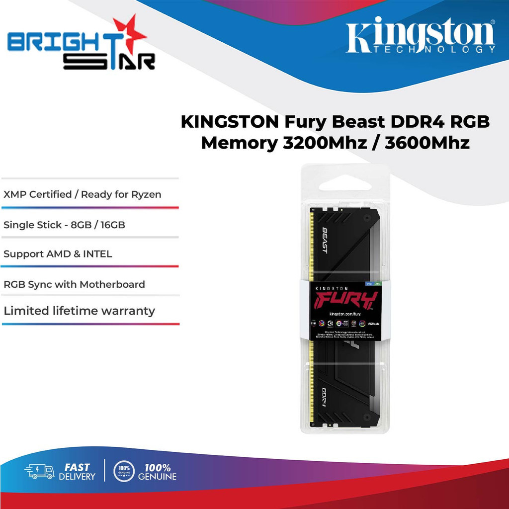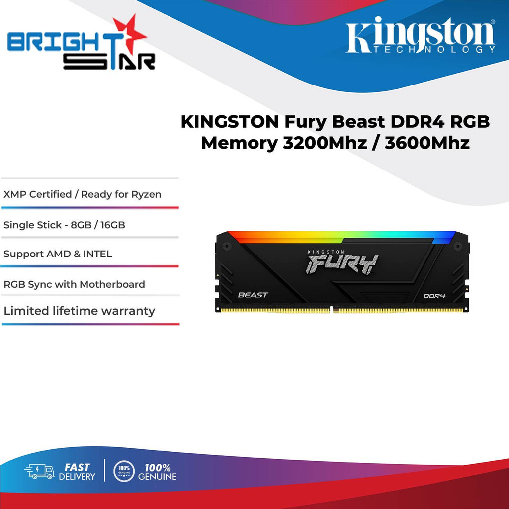 KINGSTON Fury Beast RGB DDR4 Memory Single Stick - 8GB/16GB 3200Mhz/3600Mhz