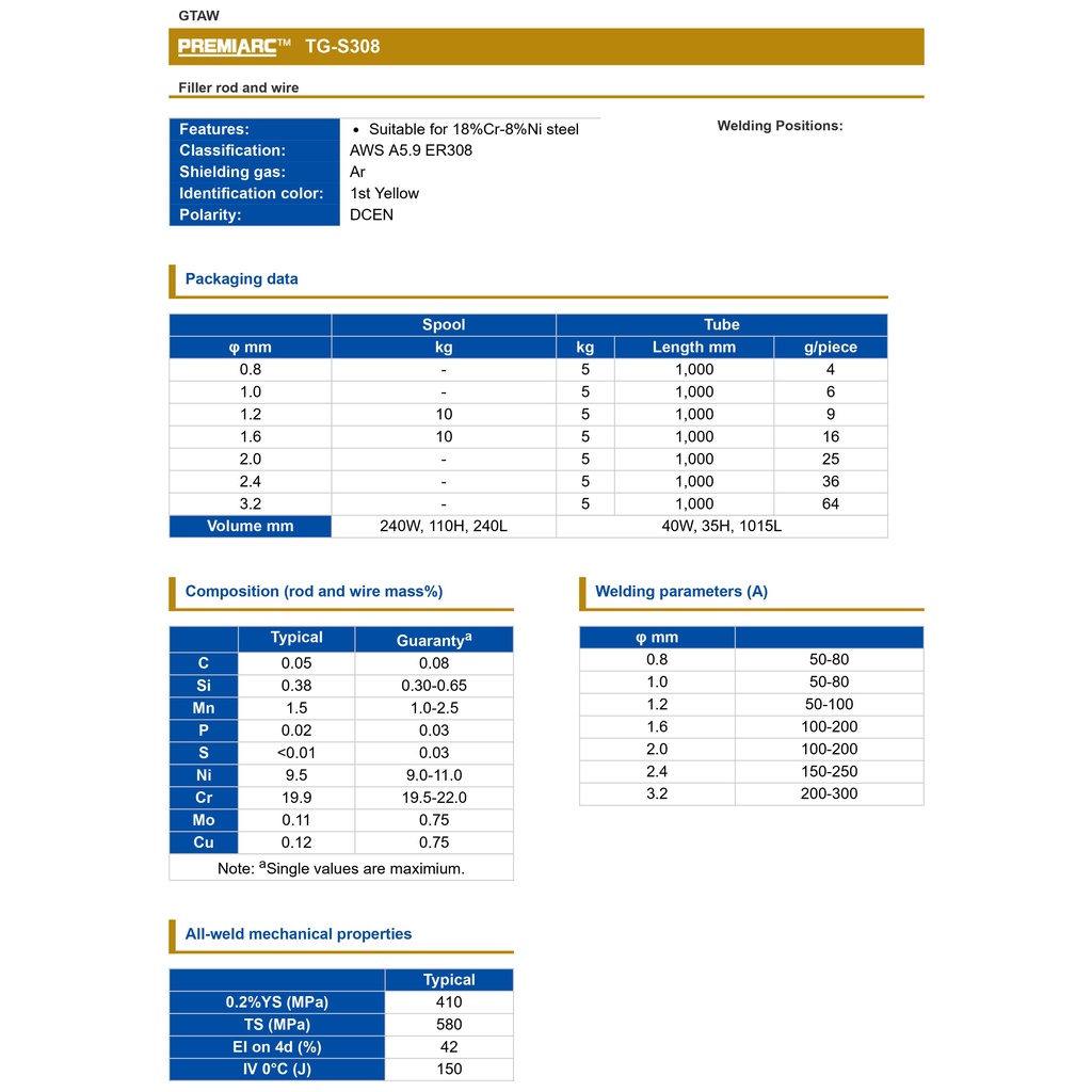 KOBELCO WELDING TIG ROD TG-S308 ( TGS308 , TGS-308 ) ER308 - Various Sizes X 1000MM 5KG
