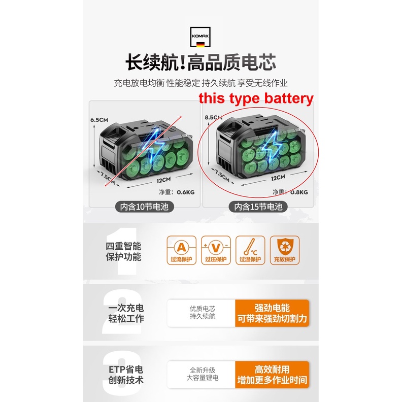 KOMAX 12"inch Cordless Brushless Chainsaw Cutting Power Tool 1*Battery 15cell