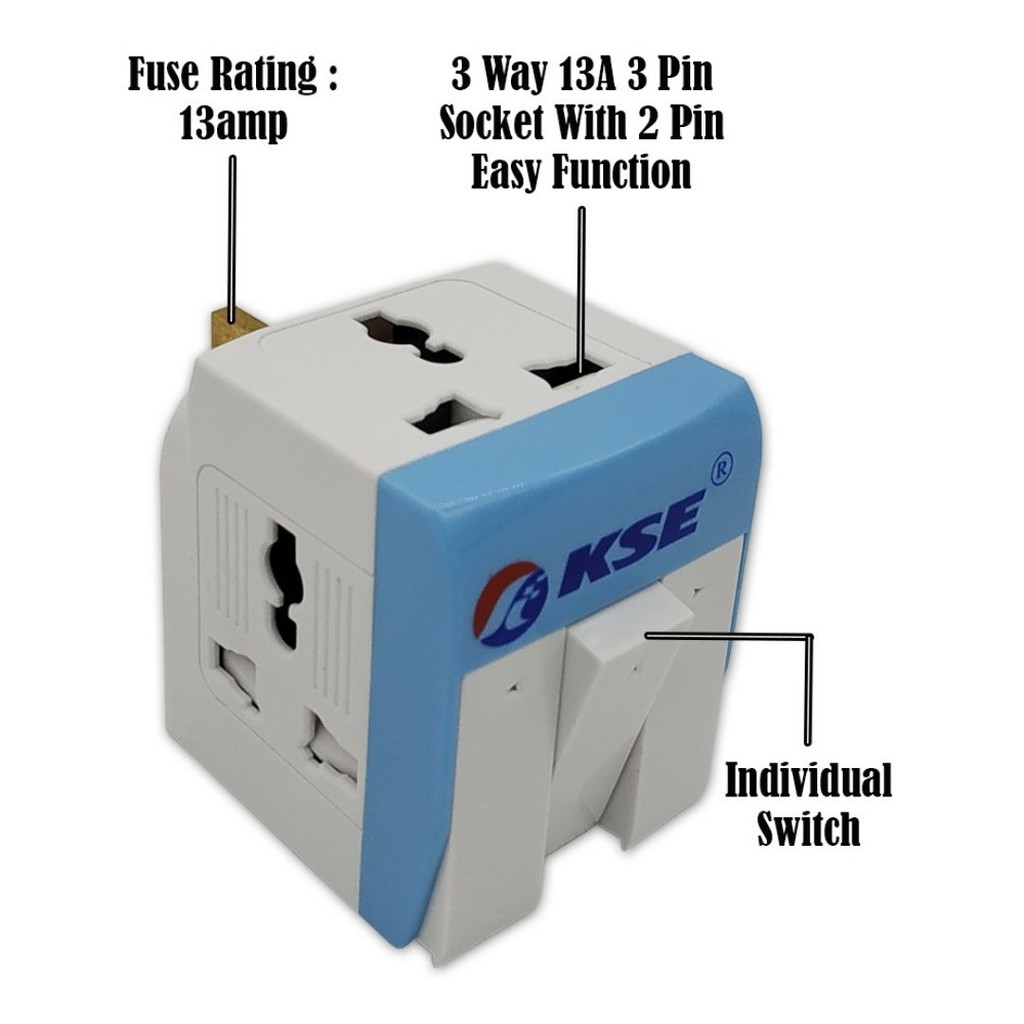 KSE 3 Way Multi Universal Plug Socket Adapter With On & Off Switch (1 Year Warranty)