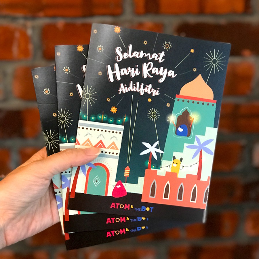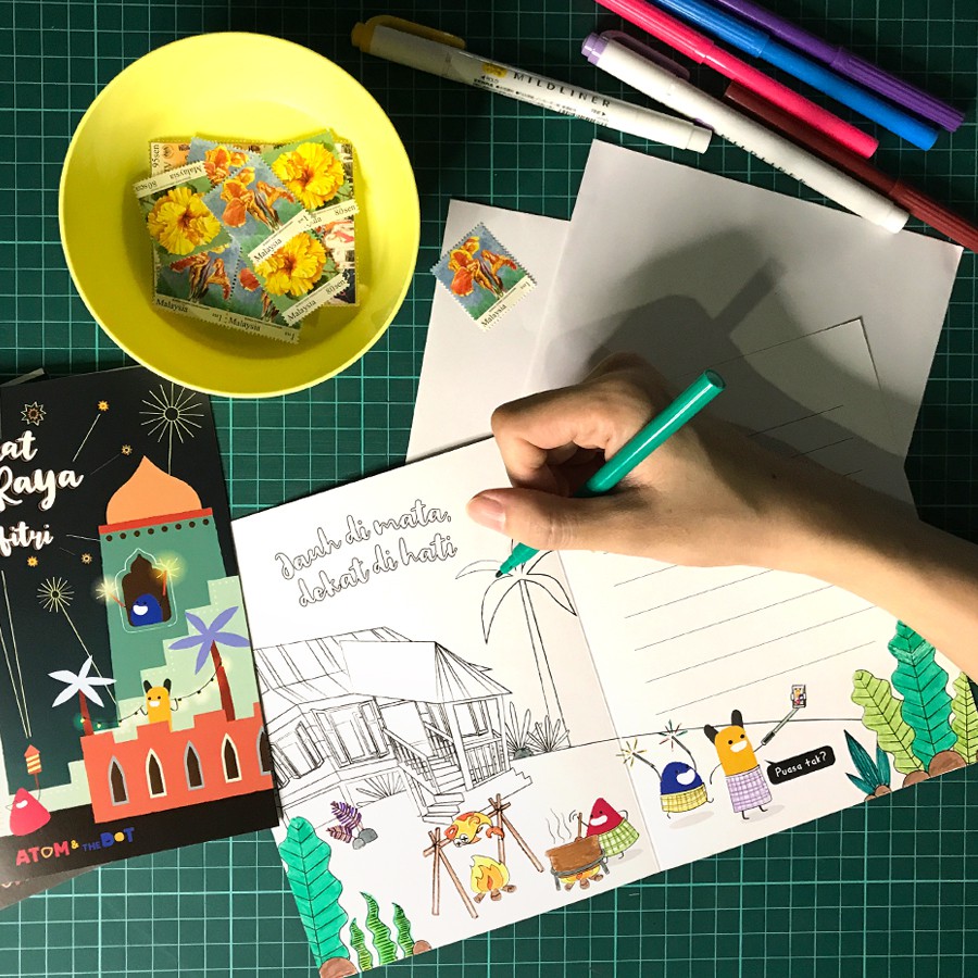 Kad Hari Raya Aidilfitri, Greeting Card Kids Colouring, (5 pcs, Pos Malaysia stamps included) by Atom & the Dot