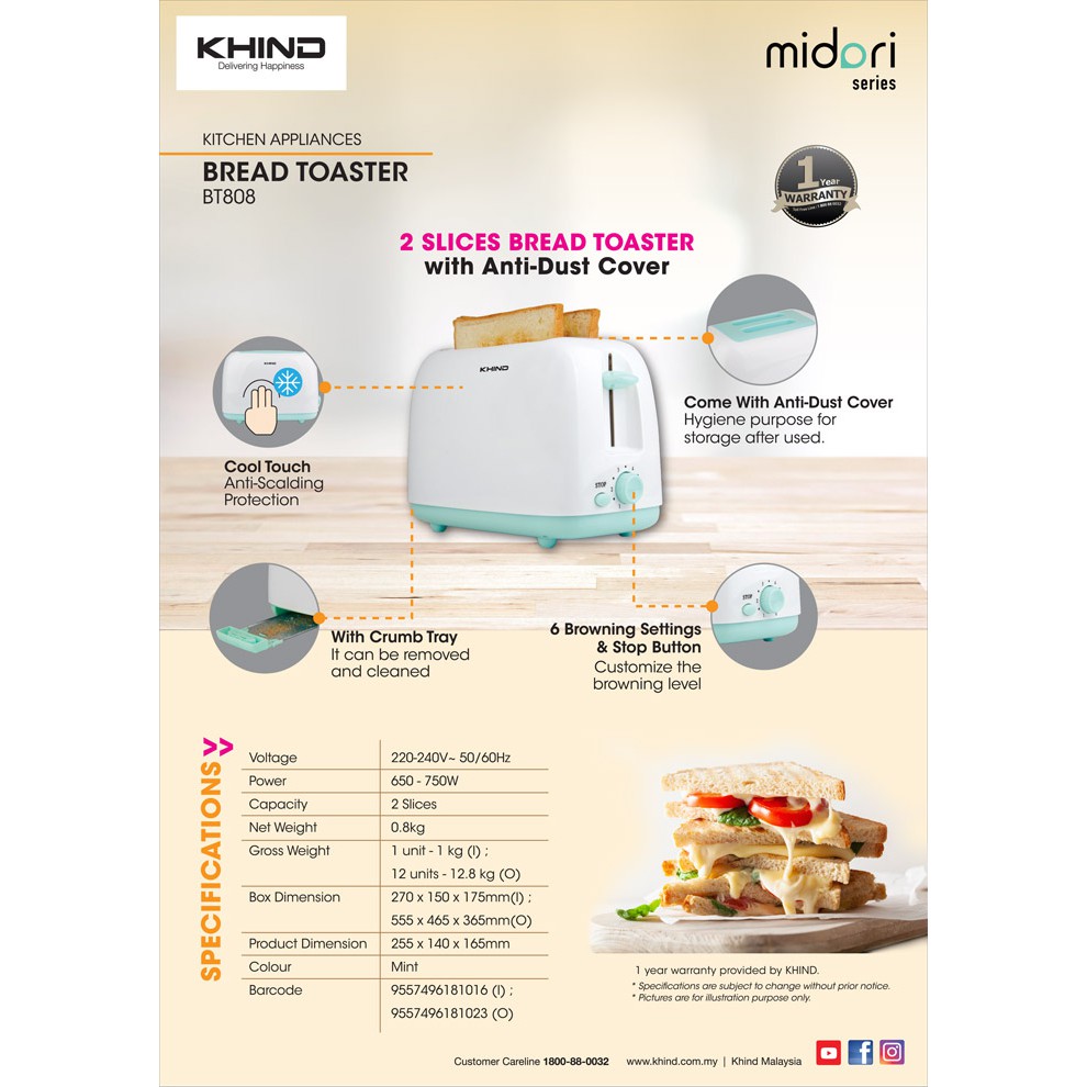 Khind Bread Toaster - BT808 (1 Year Warranty)