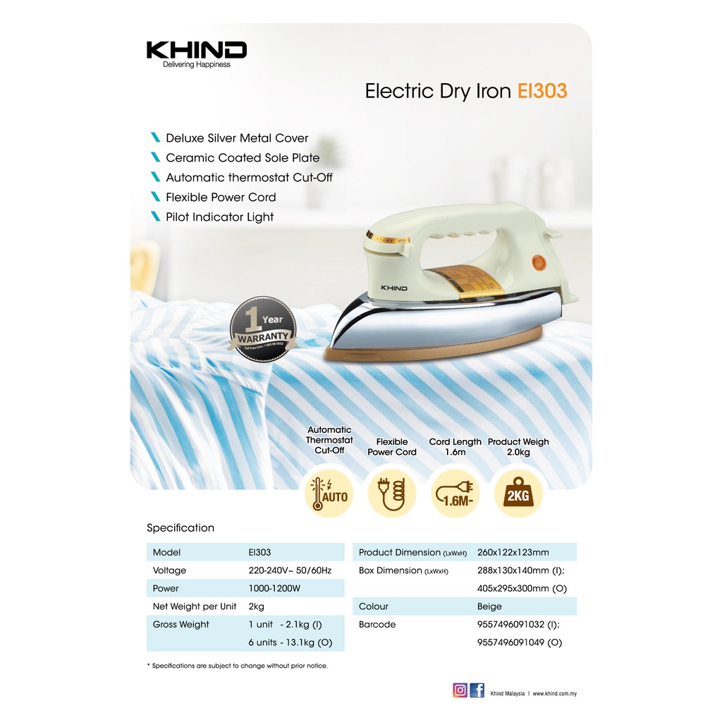 Khind EI303 Electric Dry Iron 2KG 1200W Berat Heavy