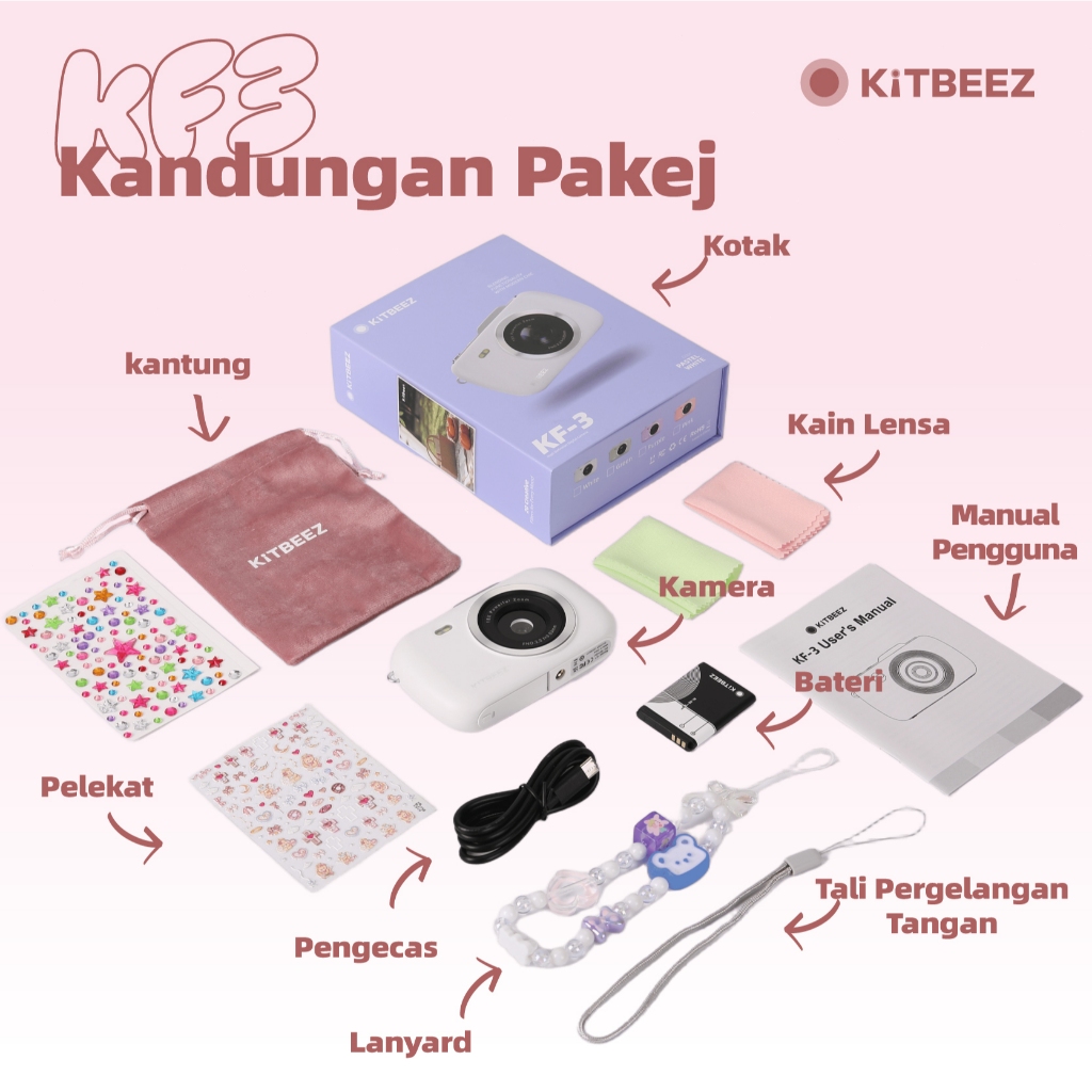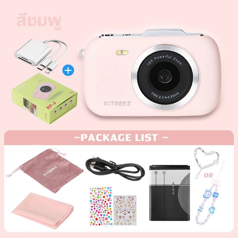 KiTBEEZ KF-3 Macaron CCD Camera 64MP Digital Camera 4K Video 18X Zoom with Built-in 4-Color Flash Filter, Free Sticker & Bracelet