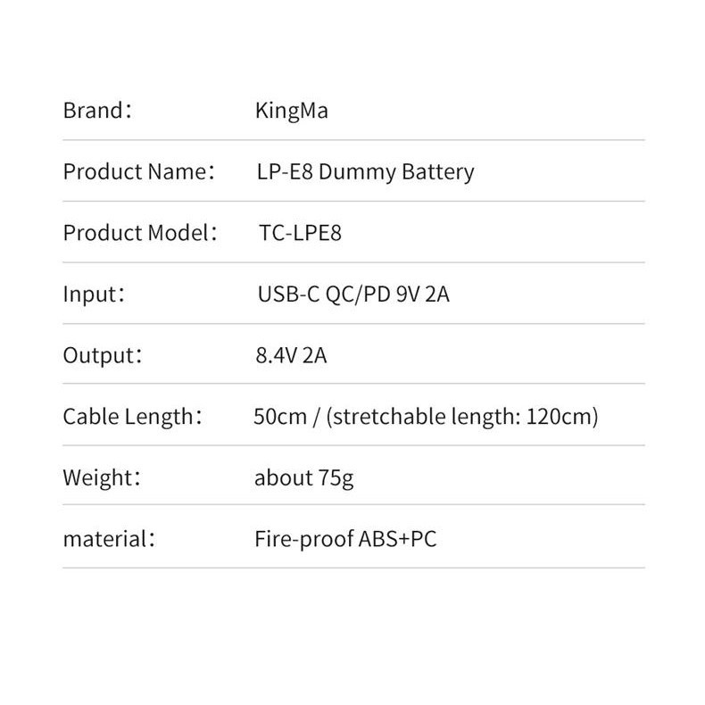 KingMa LP-E8 Dummy Battery with USB Type-C Power Adapter For Canon EOS 700D 650D 600D 550D KISS X4 X5 X6 T2i T3i T5i Camera