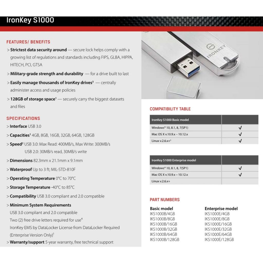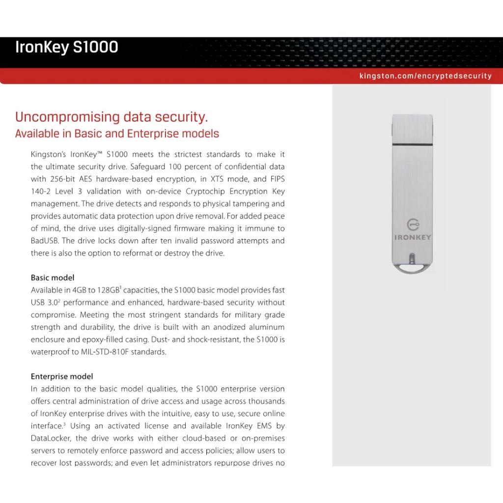 Kingston IronKey Basic S1000 Flash Drive 4GB 8GB 16GB (IKS1000B/4GB IKS1000B/8GB IKS1000B/16GB)