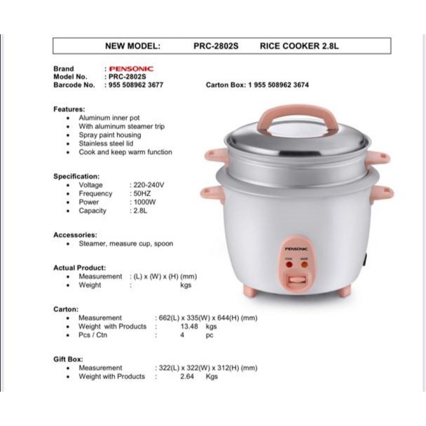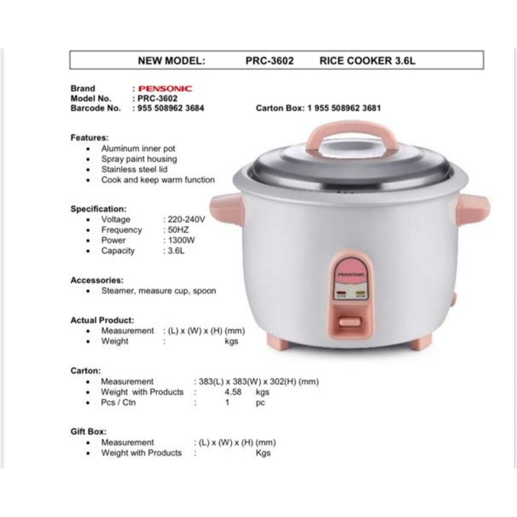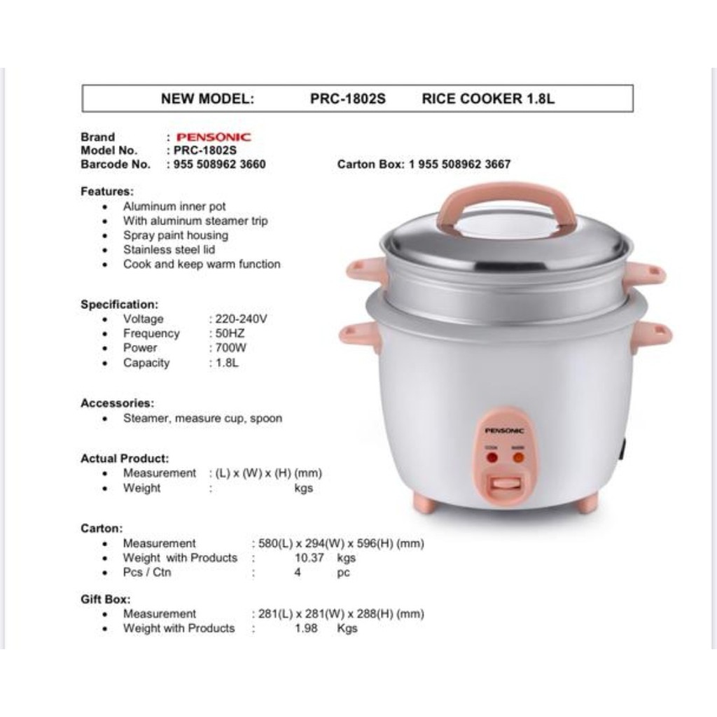 PENSONIC RICE COOKER 3.6L | 2.8L | 1.8L | 1.0L | 0.6L - PRC-3602, PRC-2802S, PRC-1802S, PRC-1002S, PRC-602S
