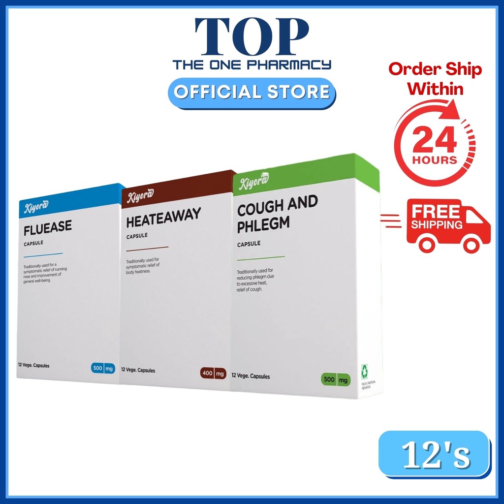 Kiyora Fluease Capsule 500mg/ Cough and Phlegm Capsule 500mg / Heateaway Capsule 400mg- 12 Vege Capsules