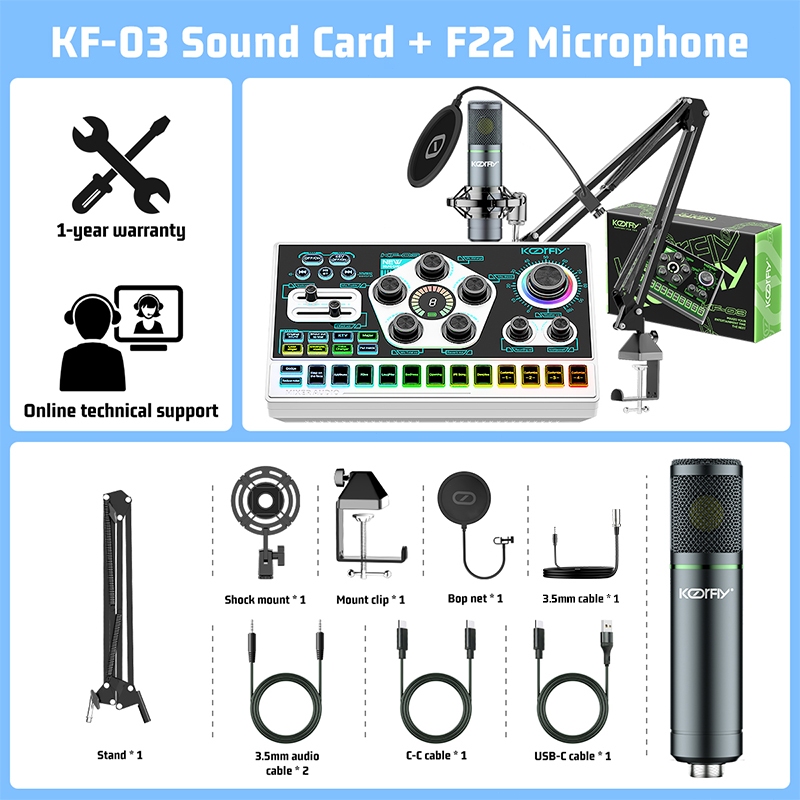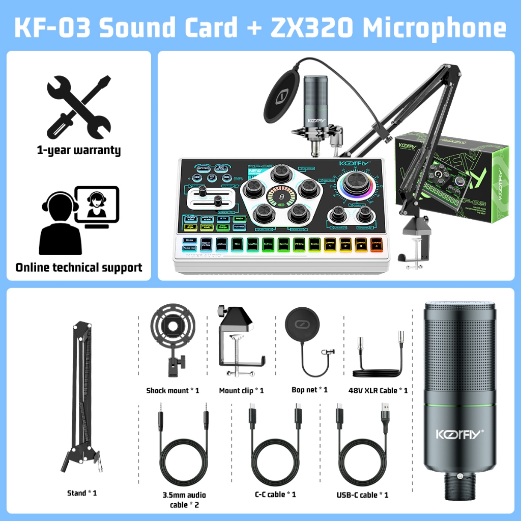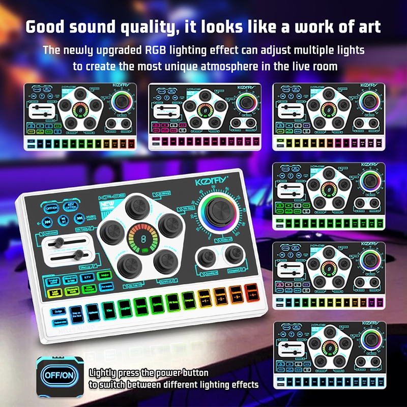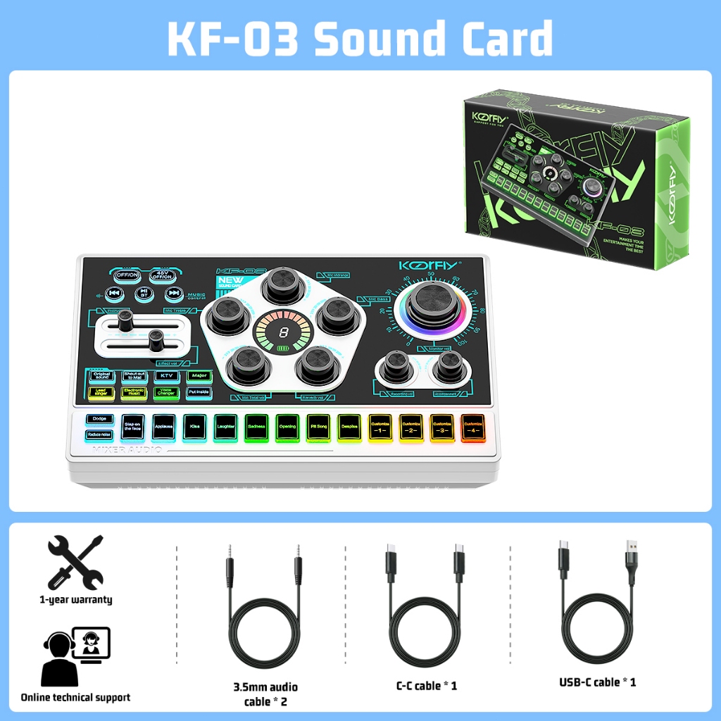 KoorFly KF03 Sound Card Audio Mixer Kad bunyi langsung Voice Changer 48V Mixer Condenser Mic Kit Eliminate Raw Songs Custom Sounds And Lights Bluetooth Sound Card Live Recording Live Streaming