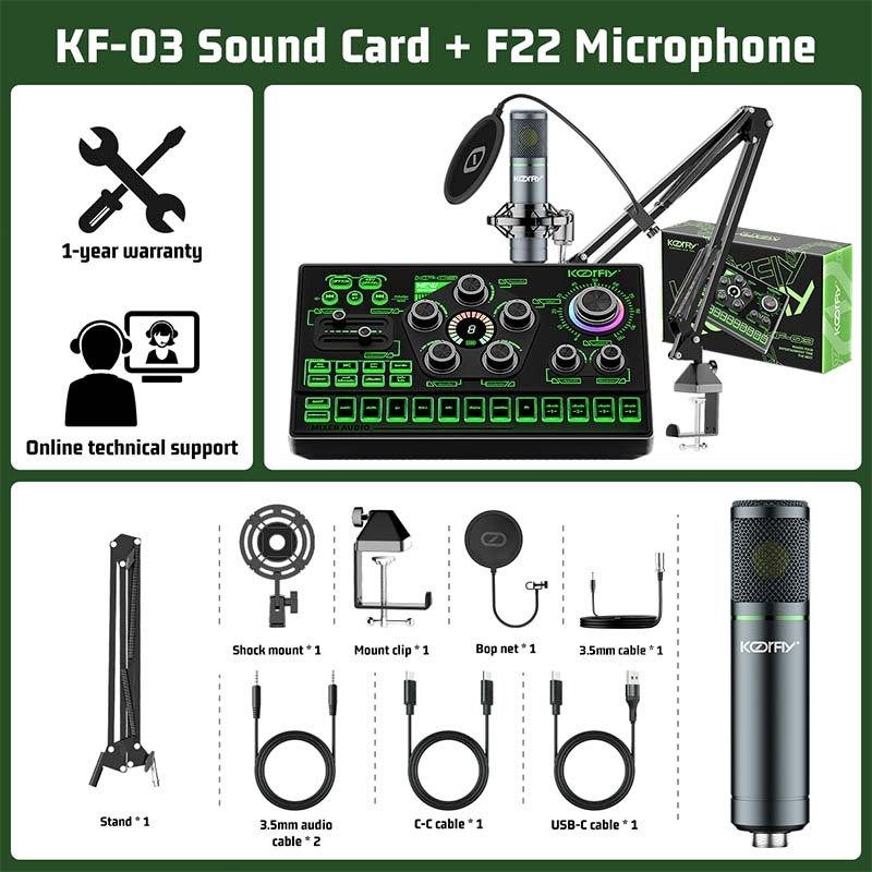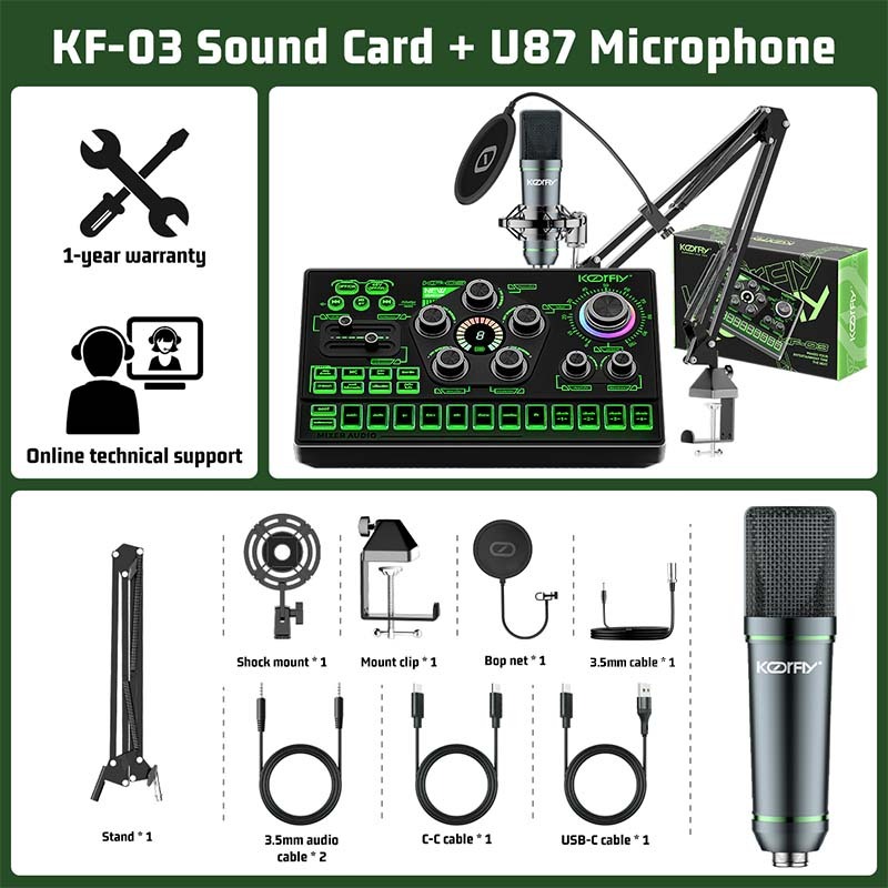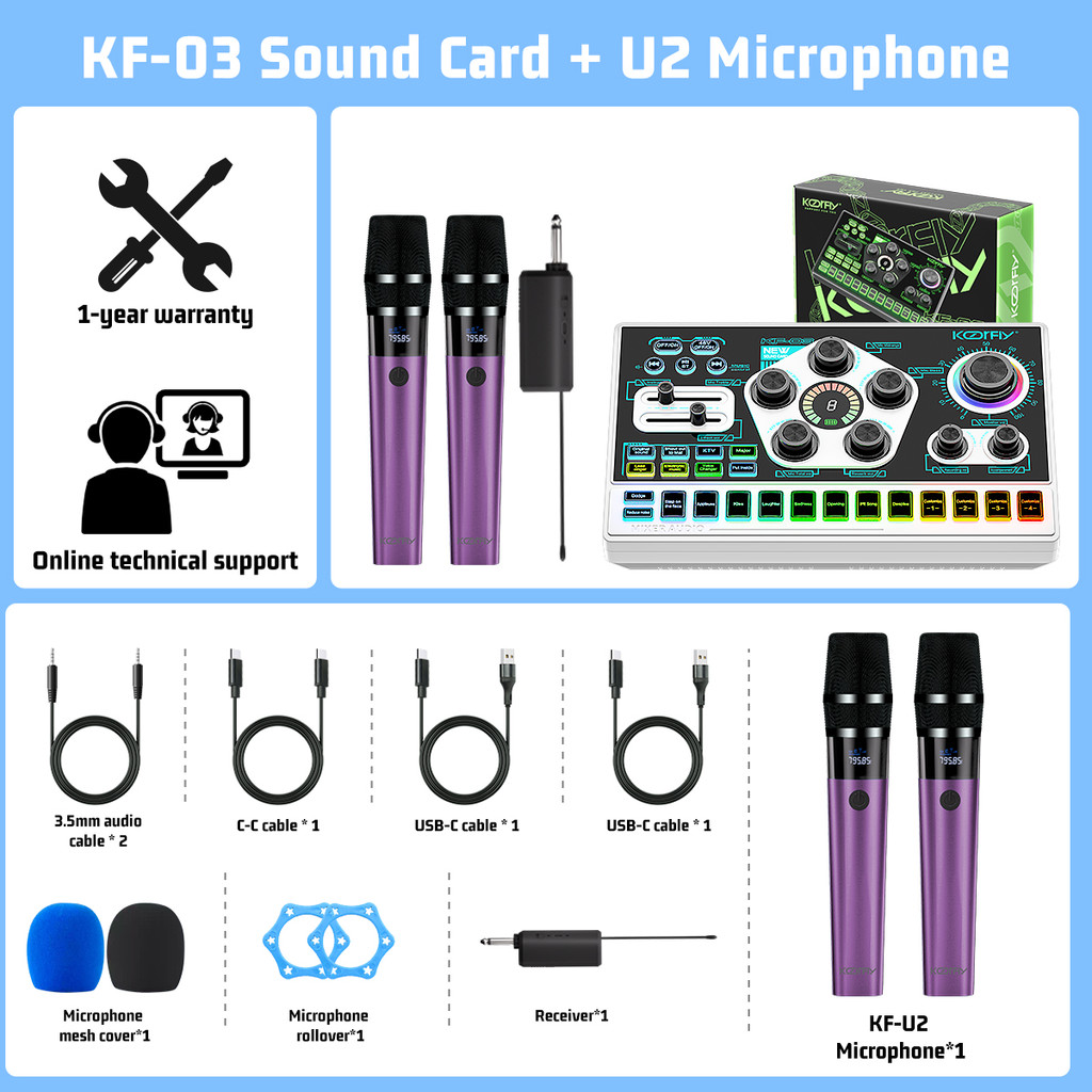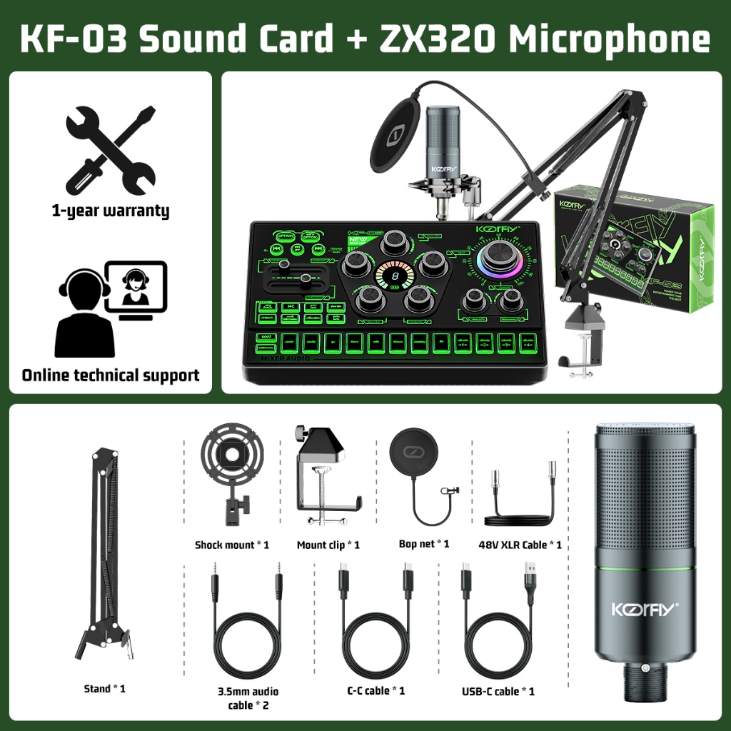 KoorFly KF03 Sound Card Audio Mixer Kad bunyi langsung Voice Changer 48V Mixer Condenser Mic Kit Eliminate Raw Songs Custom Sounds And Lights Bluetooth Sound Card Live Recording Live Streaming
