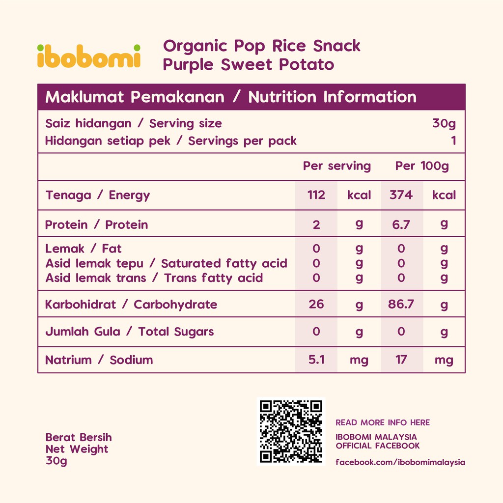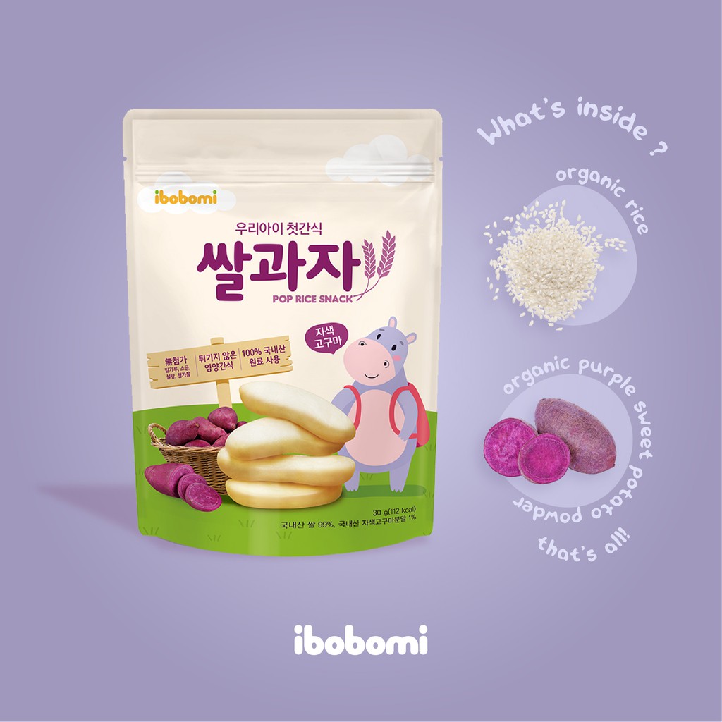Korea Ibobomi Organic Pop Rice Snack - Purple Sweet Potato (30g)