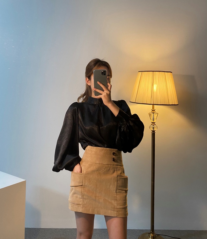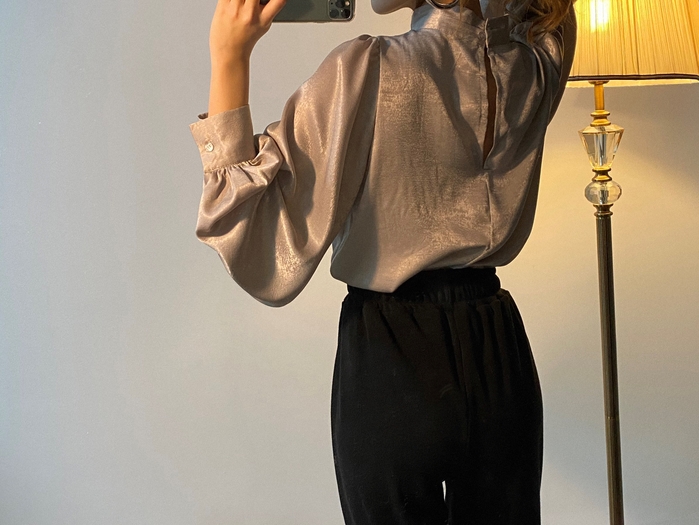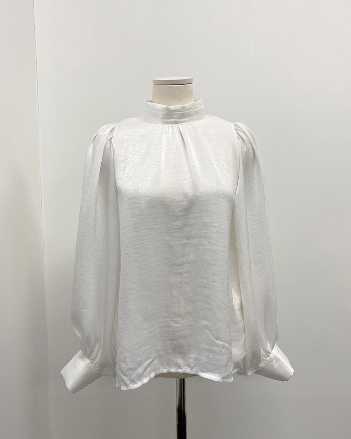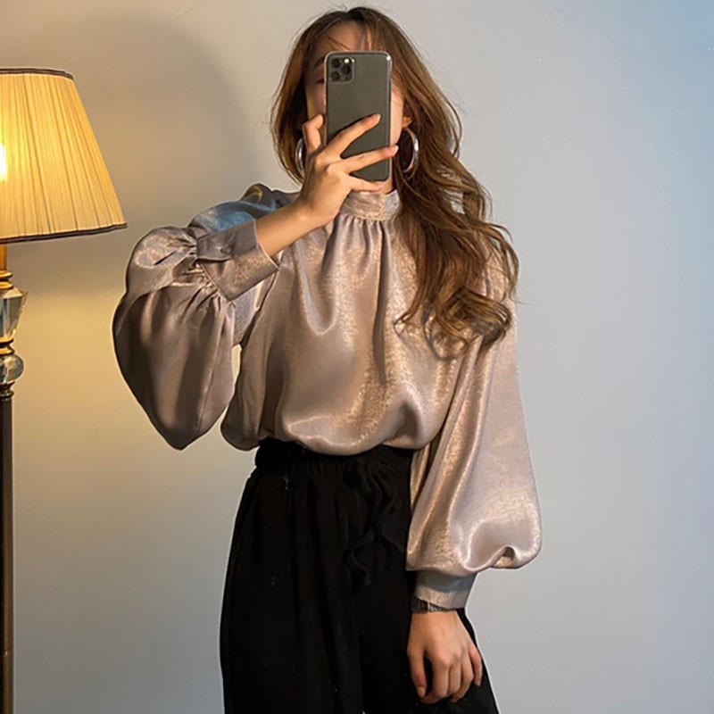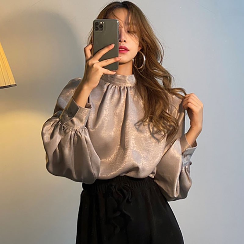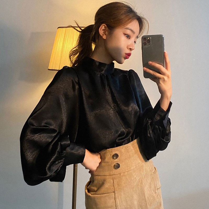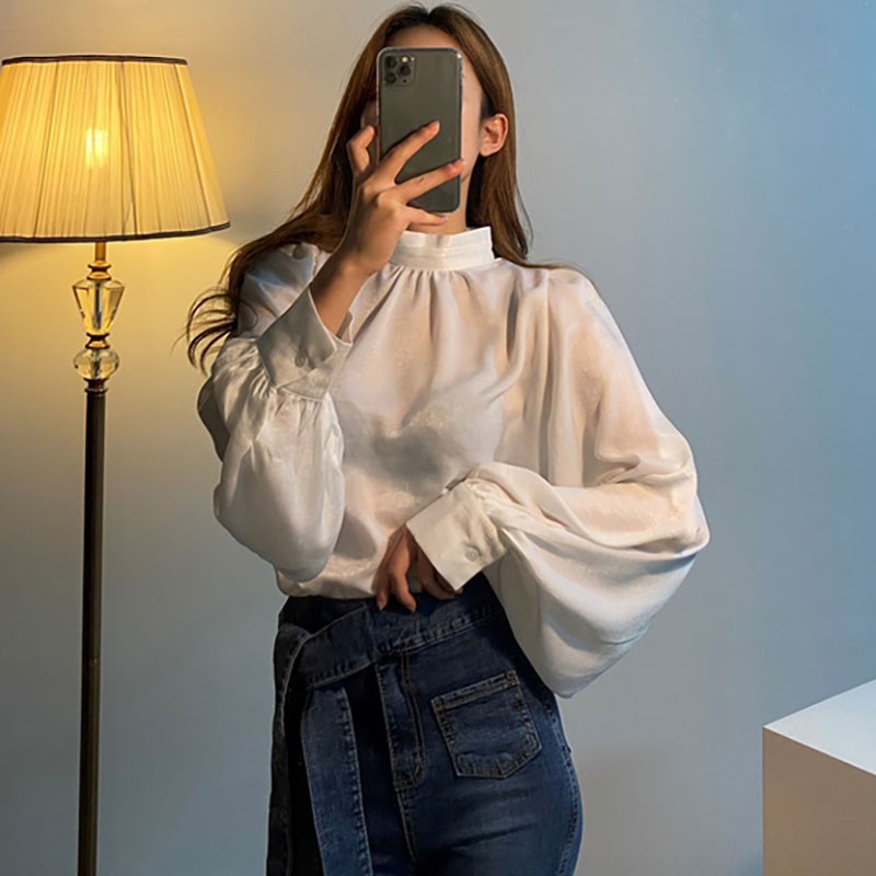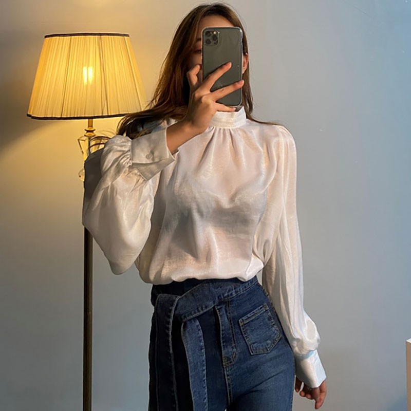 Korean Fashion Women Long Sleeve Blouse Loose Stand Collar Tops Shirt