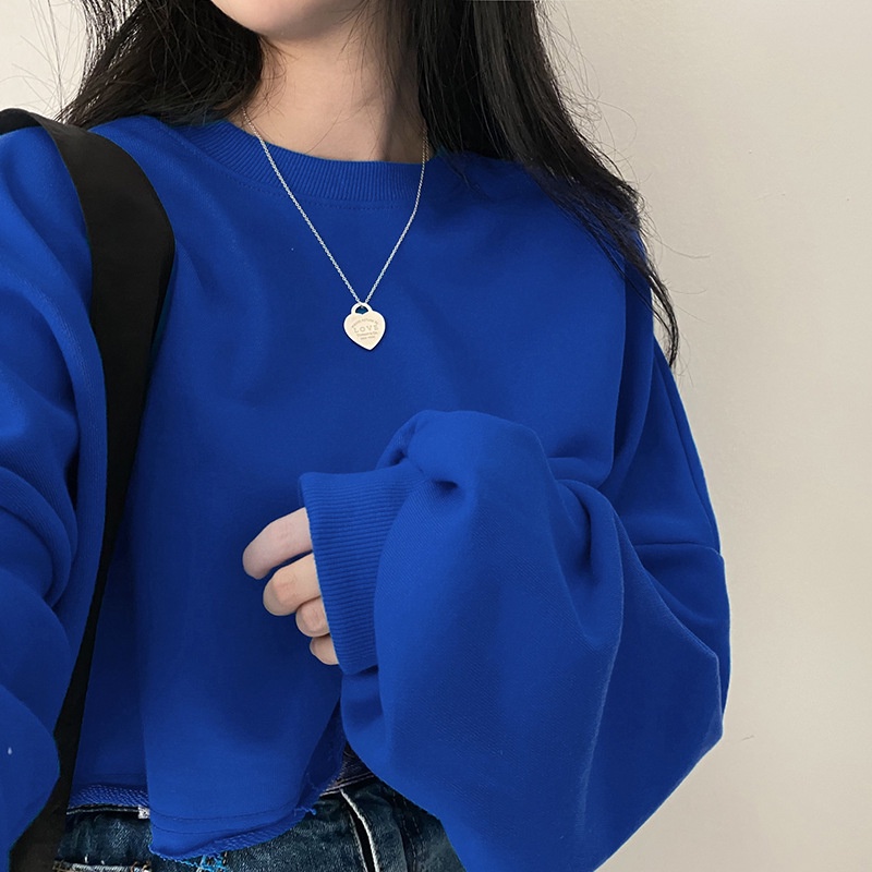 Korean Loose Solid Cropped Sweatshirts Women's Plain Long Sleeve Round Neck Casual Crop Top