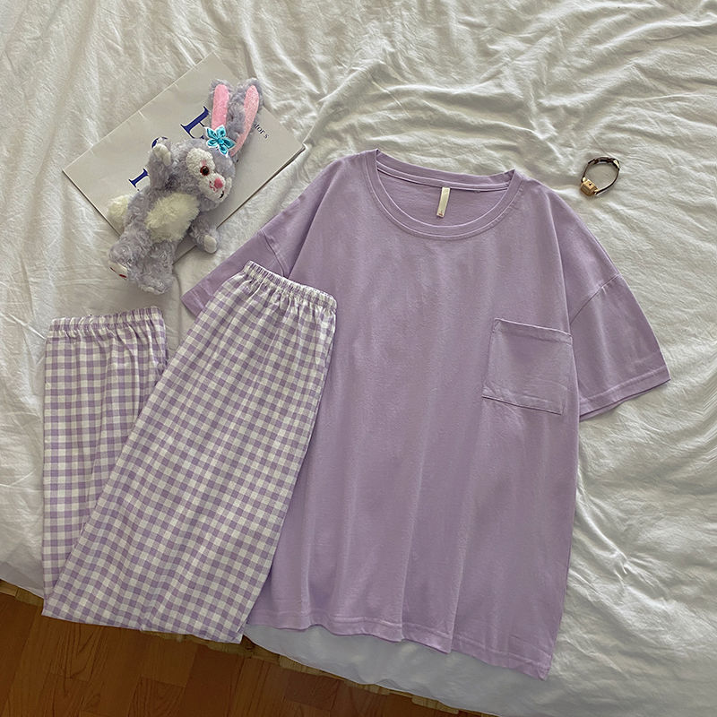 Korean plaid pyjamas pajamas women summer short-sleeved trousers nightwear set sleepwear