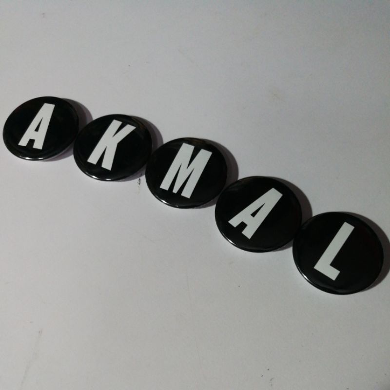 Kustom Nama Huruf Abjad Alphabet pada Button Badge {No Minimum Order} Size 25mm / 44mm