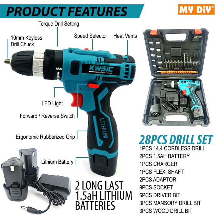 Kwsic / Allefix Cordless Drill 14.4v 2 Bateries Drill 2 Speed Torque Grip with Accessories