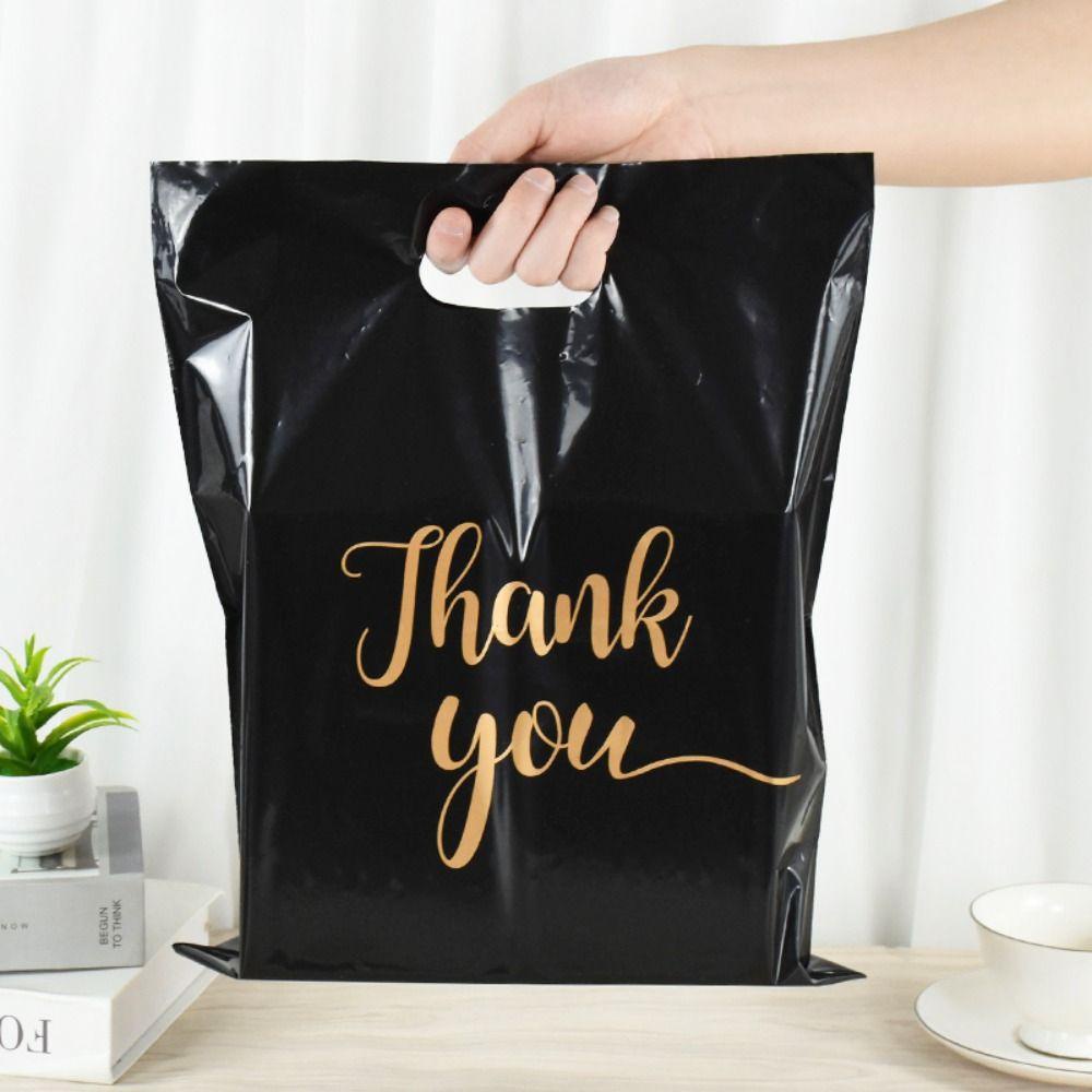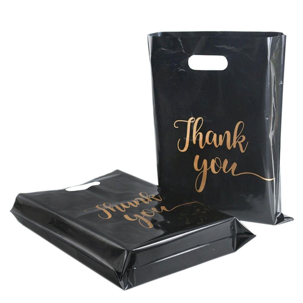 LANFY 100 Pcs Plastic Thank You Bags, with Handle Plastic Thank You Packaging Bag, Gitf Bag Waterproof Cute Black Shopping Bag Birthday