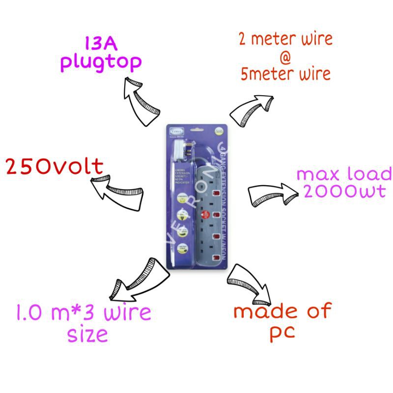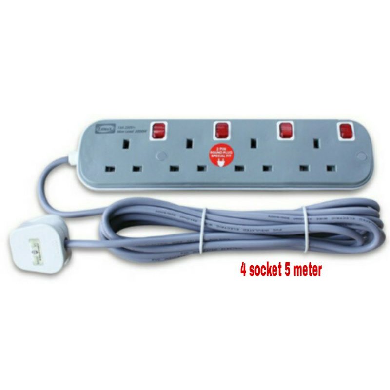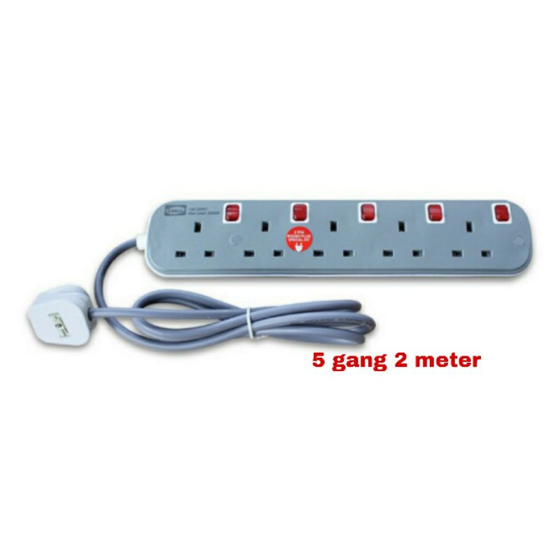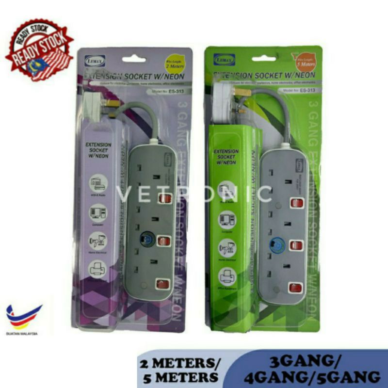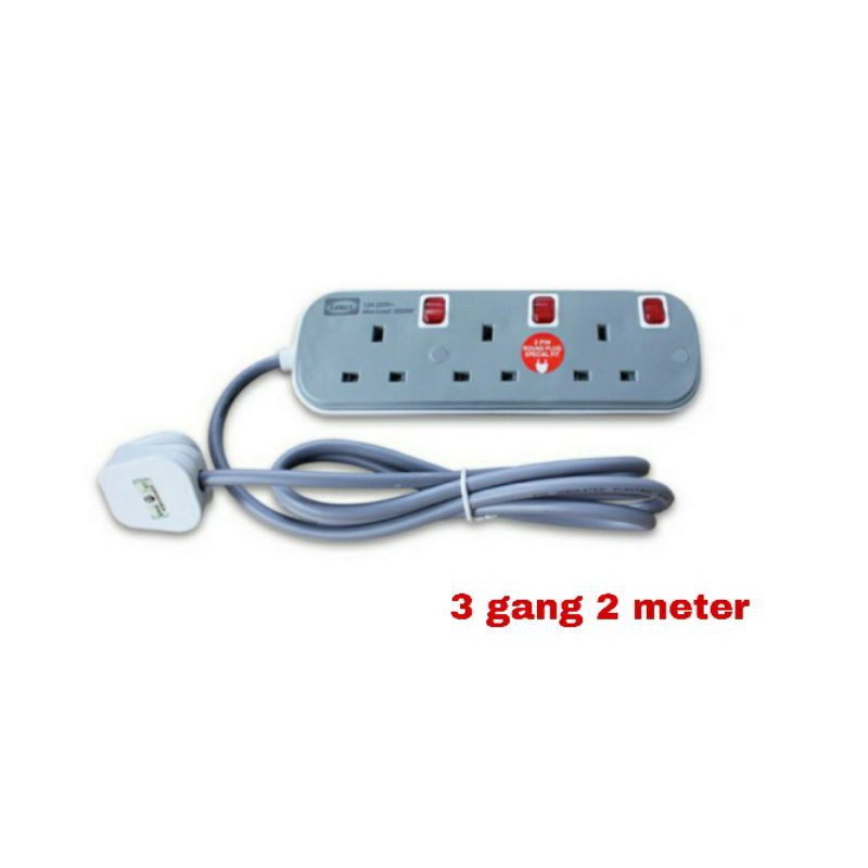 LEMAX LMX 3 Pin Extension Plug Socket SIRIM Approved with Special 2 Pin Fit 2000W Wire 2M / 5M (Grey) Light Indicator
