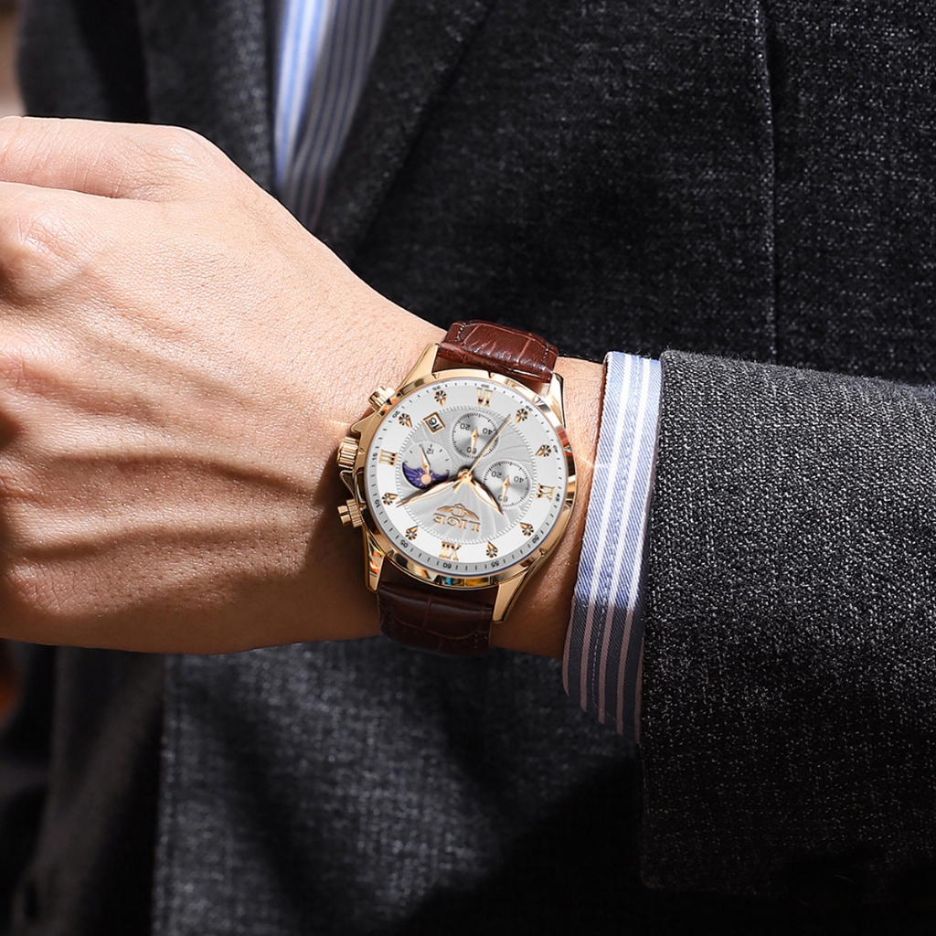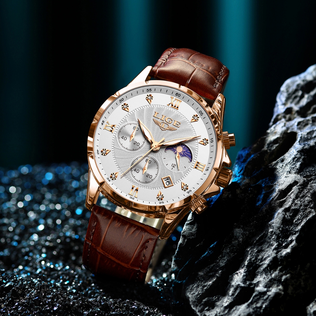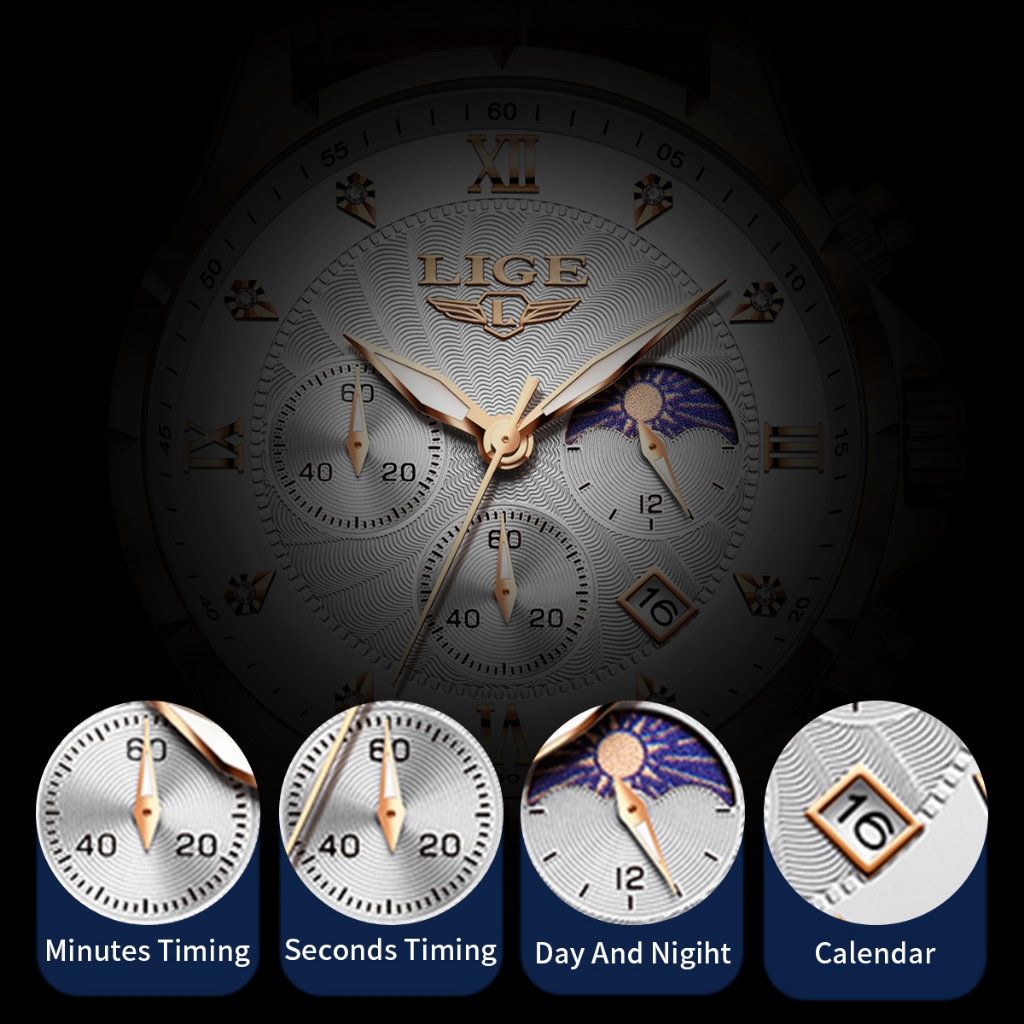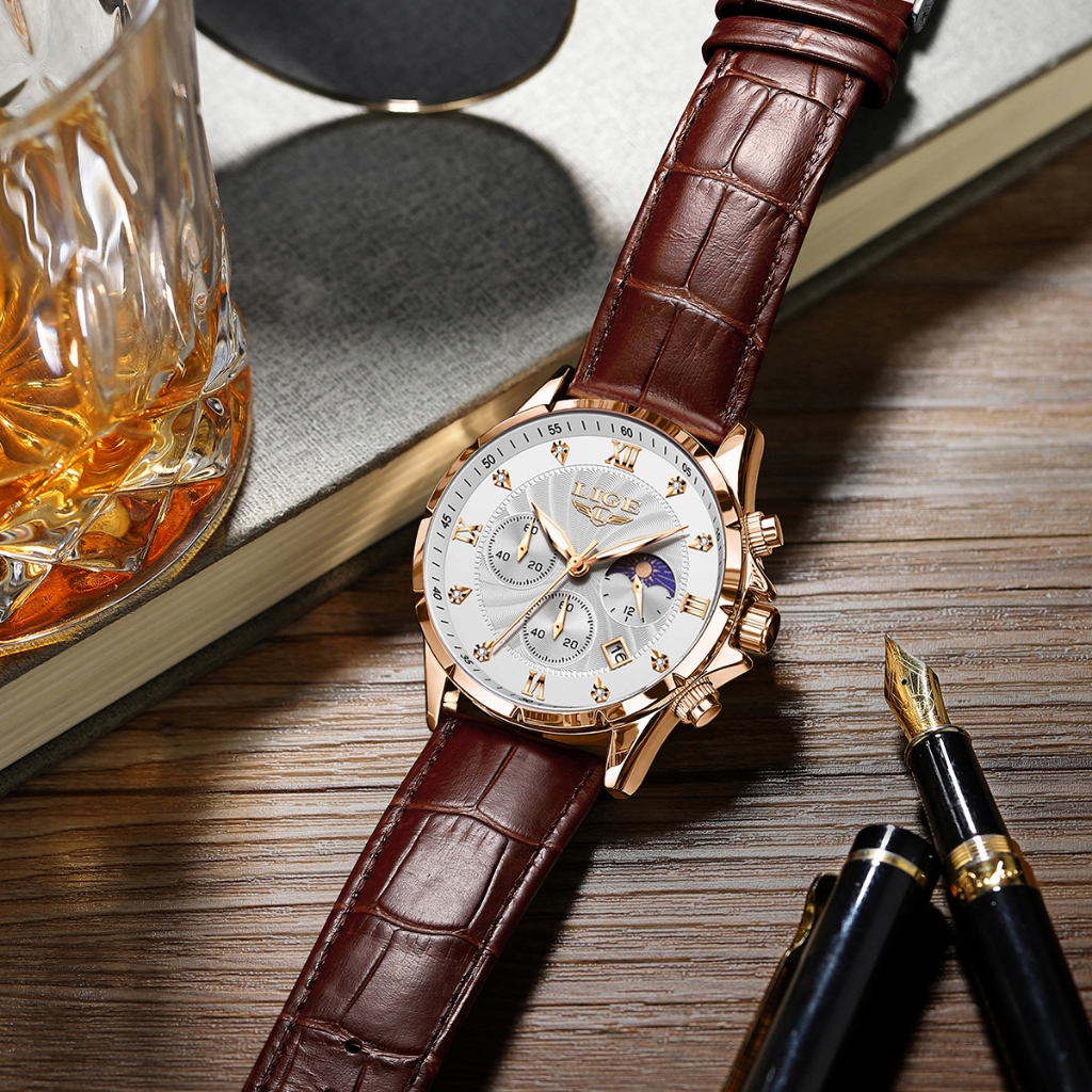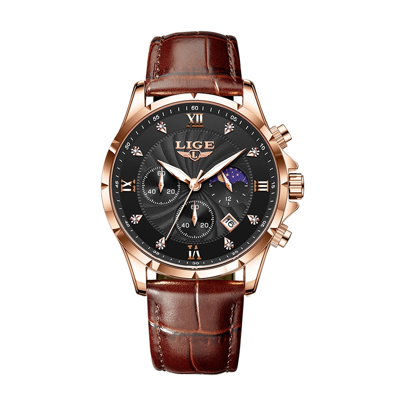 LIGE Original Men Watch Fashion Leather Strap Chronograph Sports Waterproof Luminous Wristwatch+box