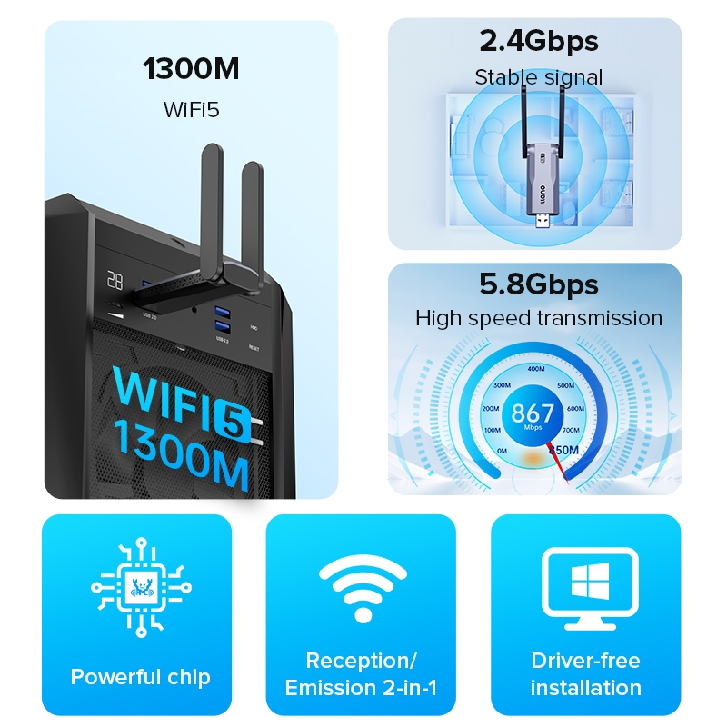 LLANO USB Wireless Network Card 1300m Gigabit High Speed Dual Band WiFi Desktop Laptop Computer Host External Internet Access Receiver Transmitter Driver Free Signal Enhancement
