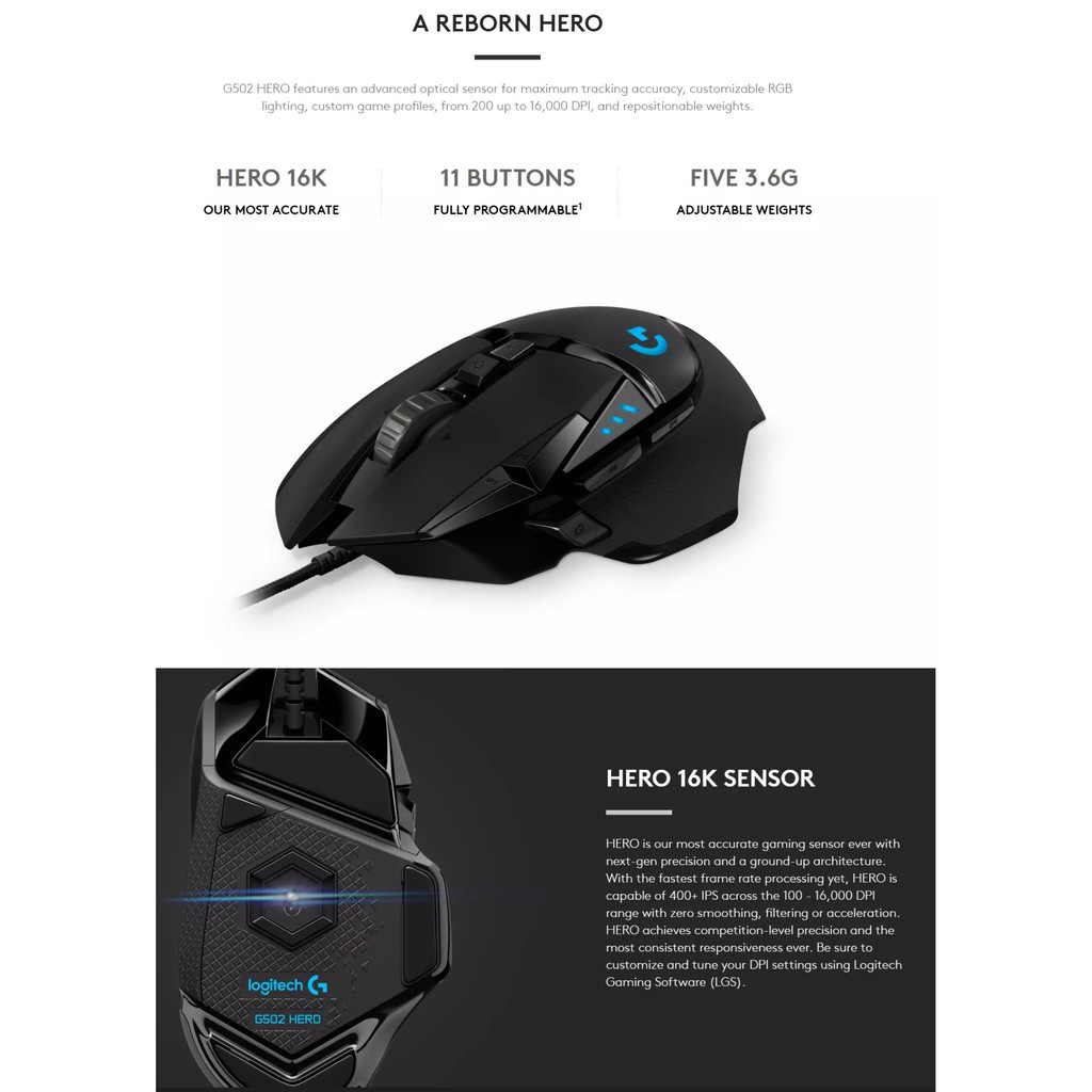 LOGITECH G502 HERO HIGH PERFORMANCE GAMING MOUSE 25,600 DPI 11 PROGRAMMABLE BUTTONS LIGHTSYNC RGB 1 MS REPORT RATE