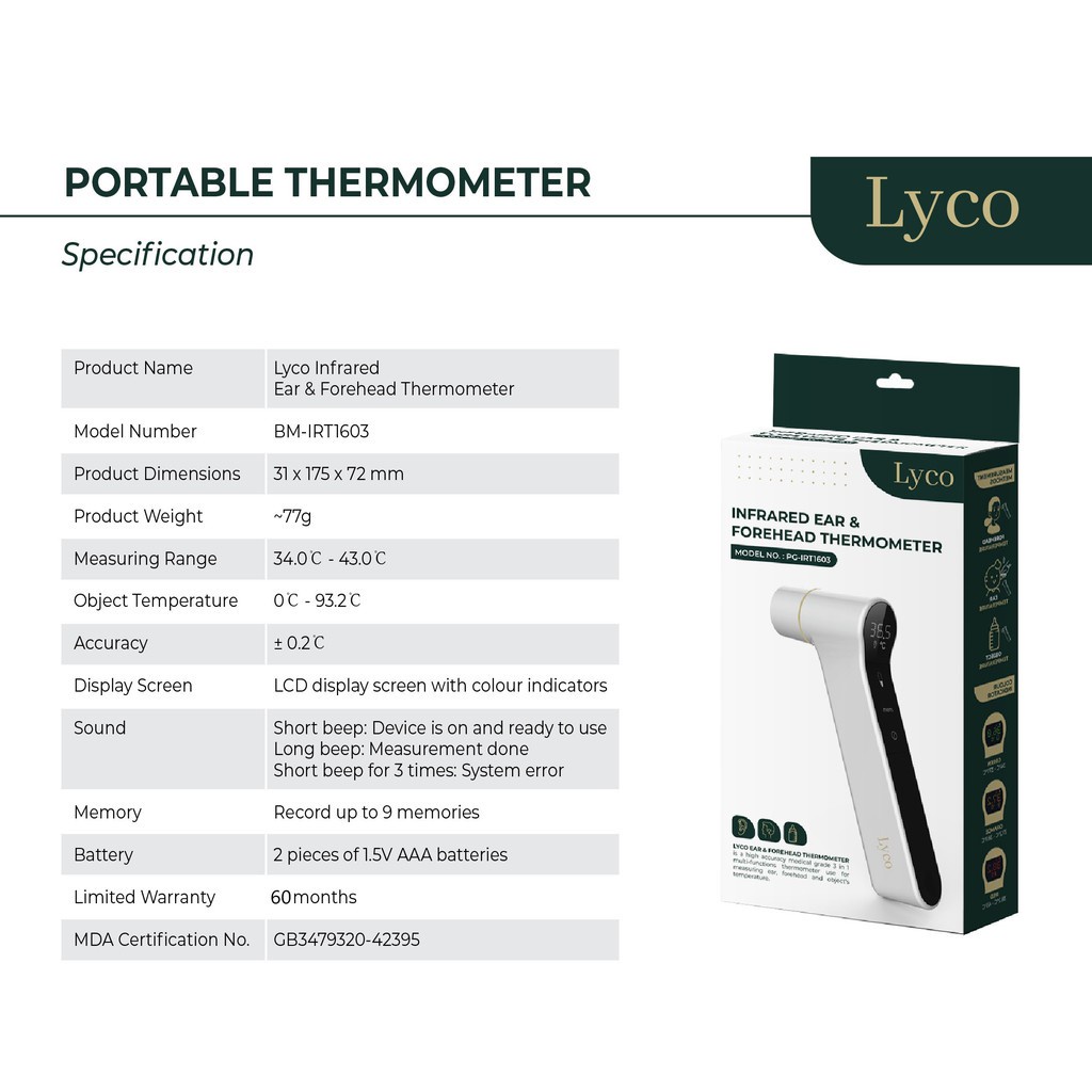Alpro Pharmacy Exclusive - LYCO 3 in 1 Infrared Ear & Forehead Thermometer | 5 Years Warranty