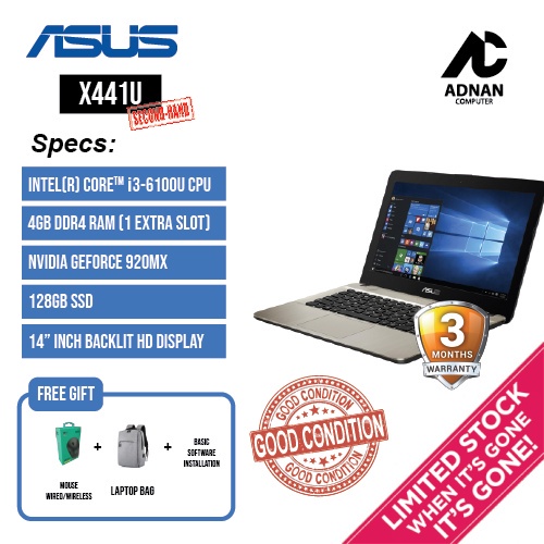Laptop Secondhand / Refurbished ASUS X441U 14" LED ( i3 , 4GB RAM , 128GB SSD , GeForce 920MX Graphics )