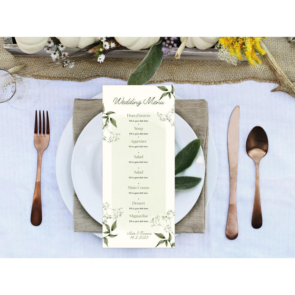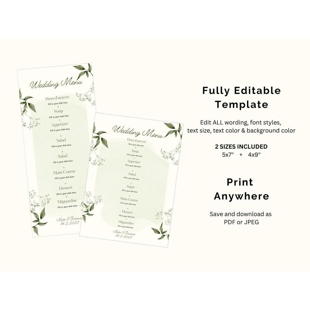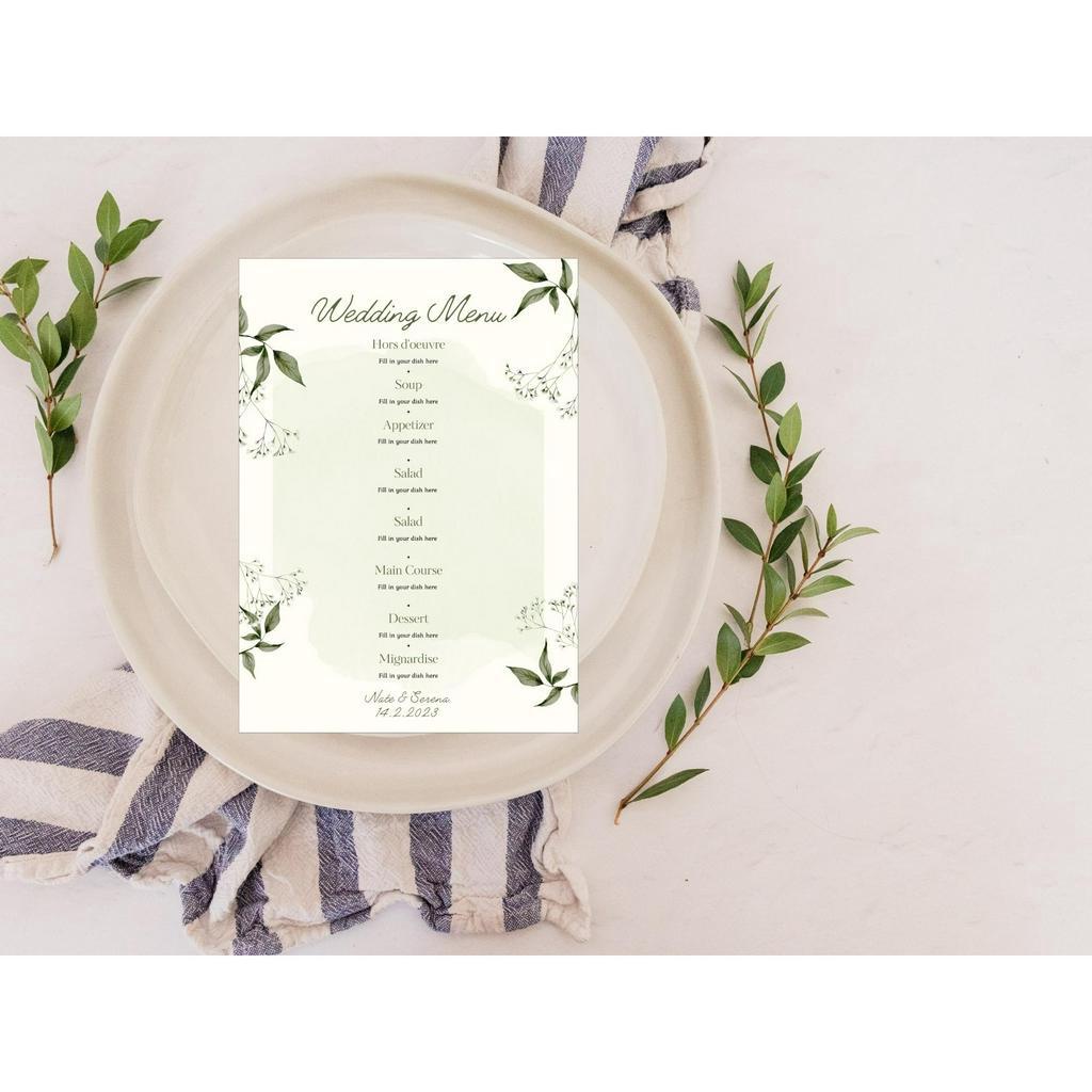 Leafy Green Theme Wedding Menu Food Card | Fully Editable Template | Simple Wedding Menu | Digital Printable Design