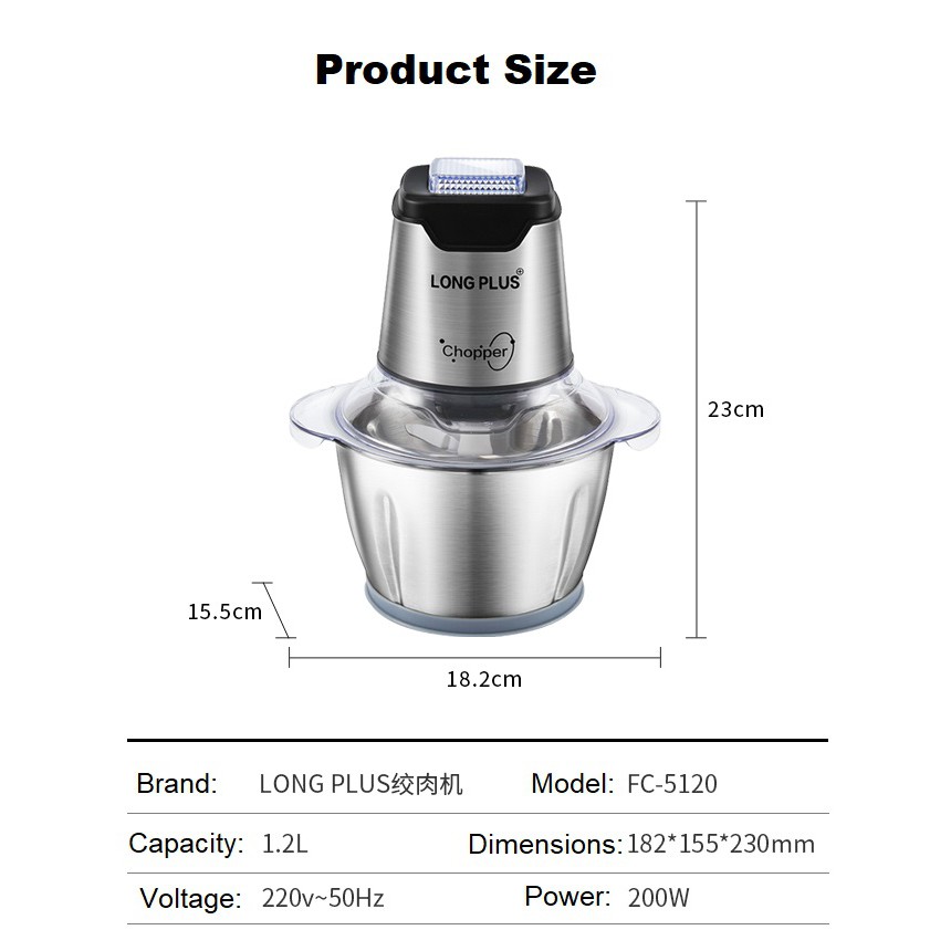 Long Plus 1.2L Electric Kitchen Meat Grinder Chopper Shredder Food Chopper Stainless Steel Processor With Garlic peeler