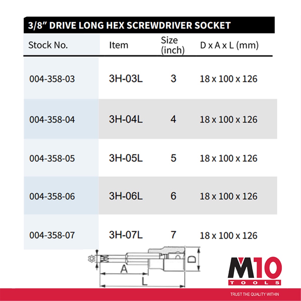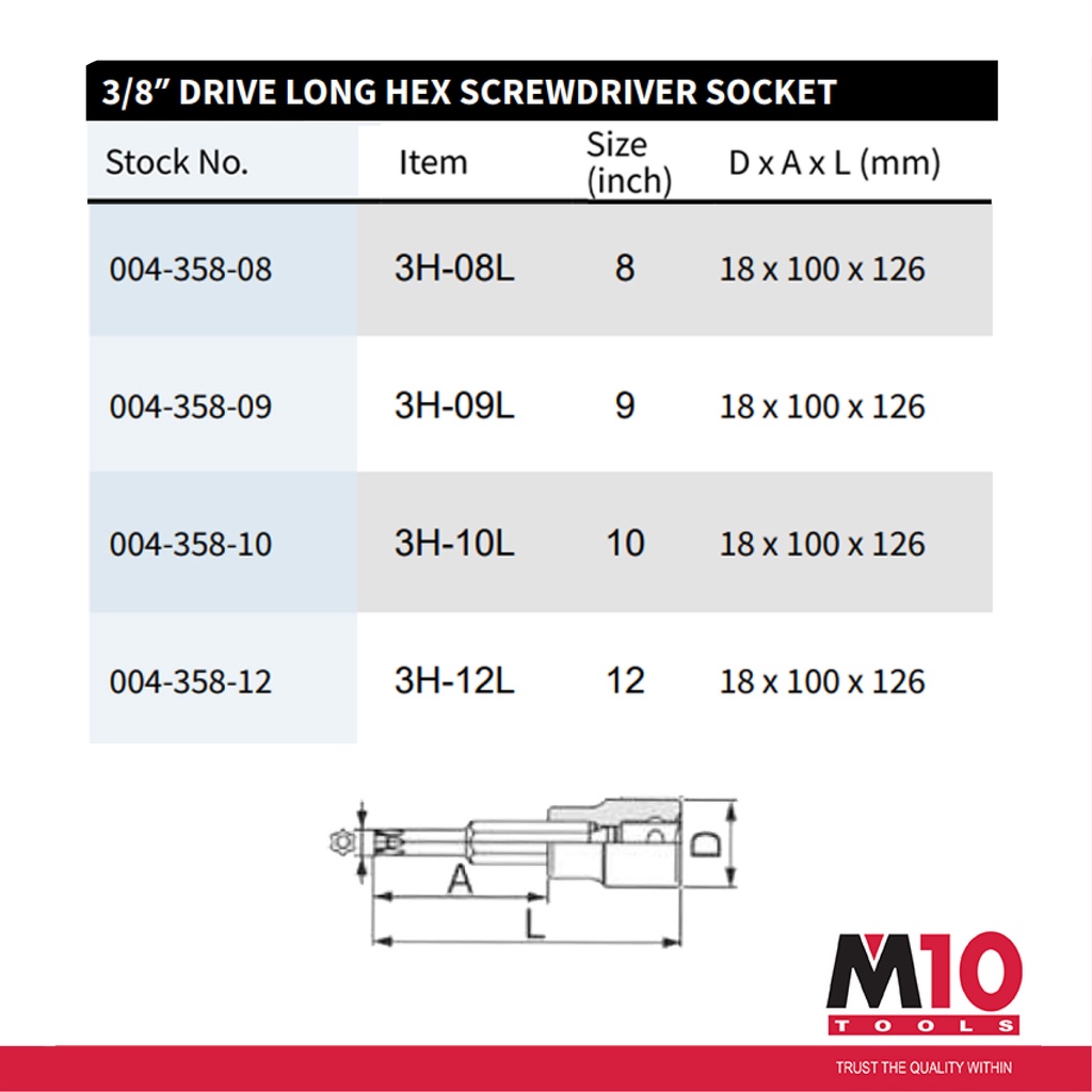 M10 Drive Long Hex Screwdriver Socket - mm - 3 / 4 / 5 / 6 / 7 / 8 / 9 / 10 / 12mm
