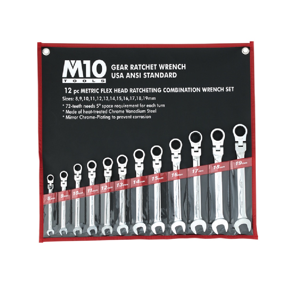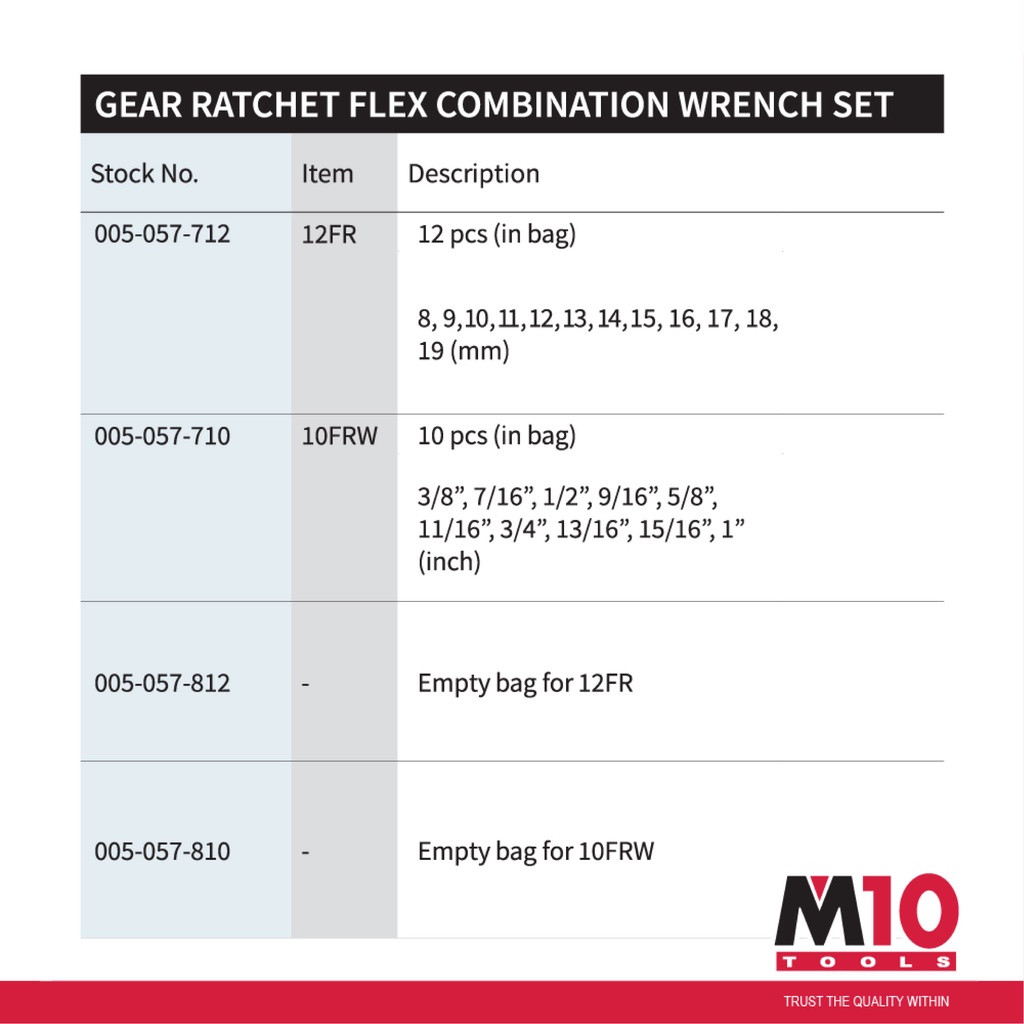 M10 Gear Ratchet Flex Combination Wrench Set - 10 / 12 Pcs
