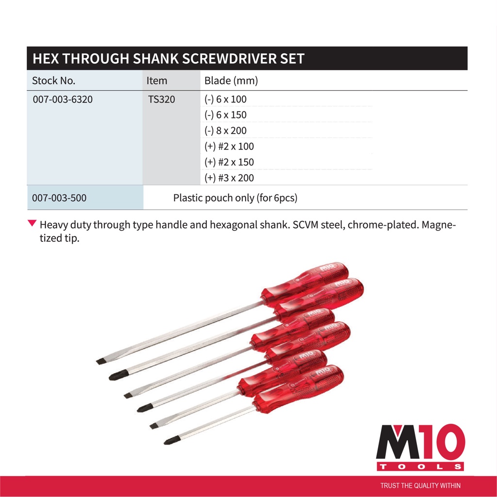 M10 Hex Through Shank Screwdriver Set (6 Pcs)
