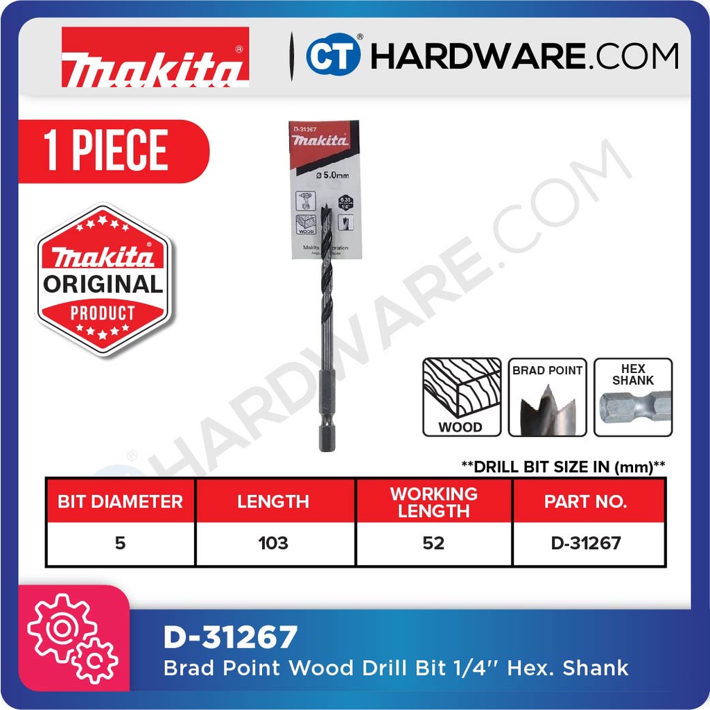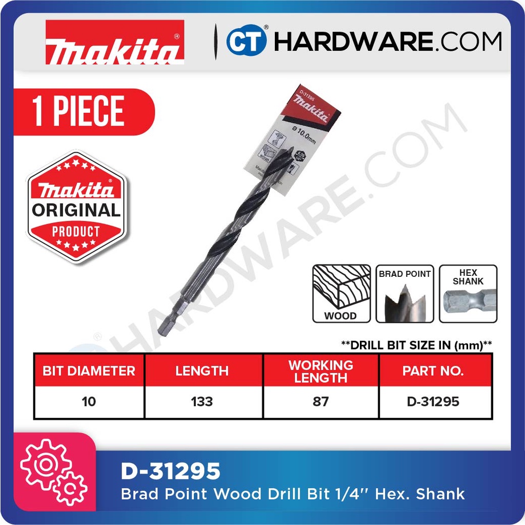 MAKITA BRAD POINT WOOD DRILL BIT 1/4" HEX SHANK SIZE 5MM TO 15MM - 1PC