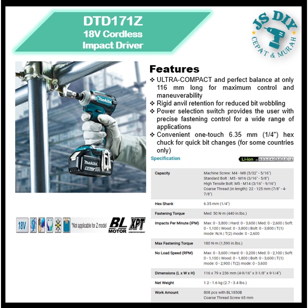 MAKITA DTD171RTJ / DTD171RFJ / DTD171Z 18V Cordless Impact Driver