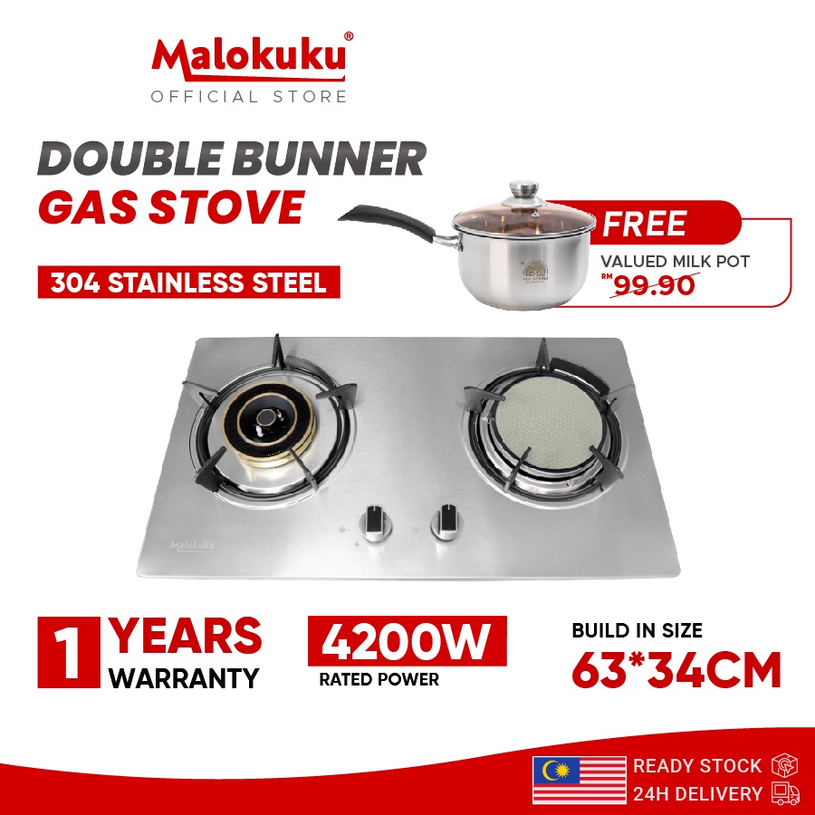 MALOKUKU Stainless Steel Premium Infrared Gas Stove | 2 Burner Cooktop Built In Hob | Dapur Gas Cooker Hob Free Milk Pot