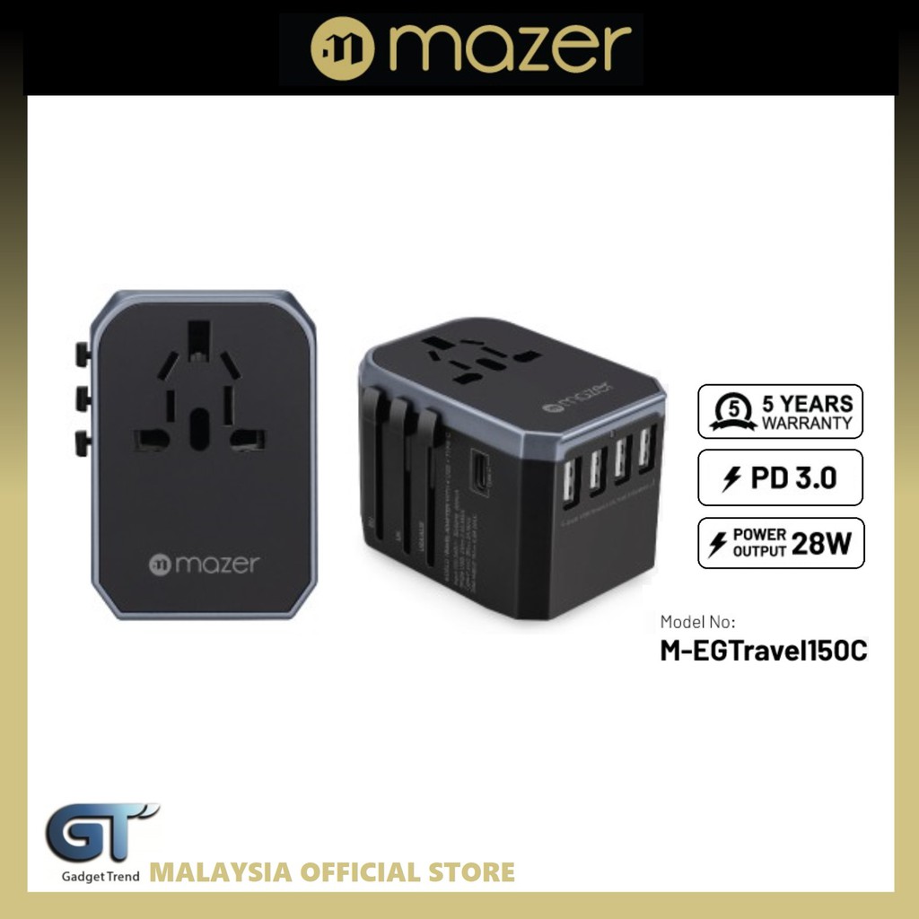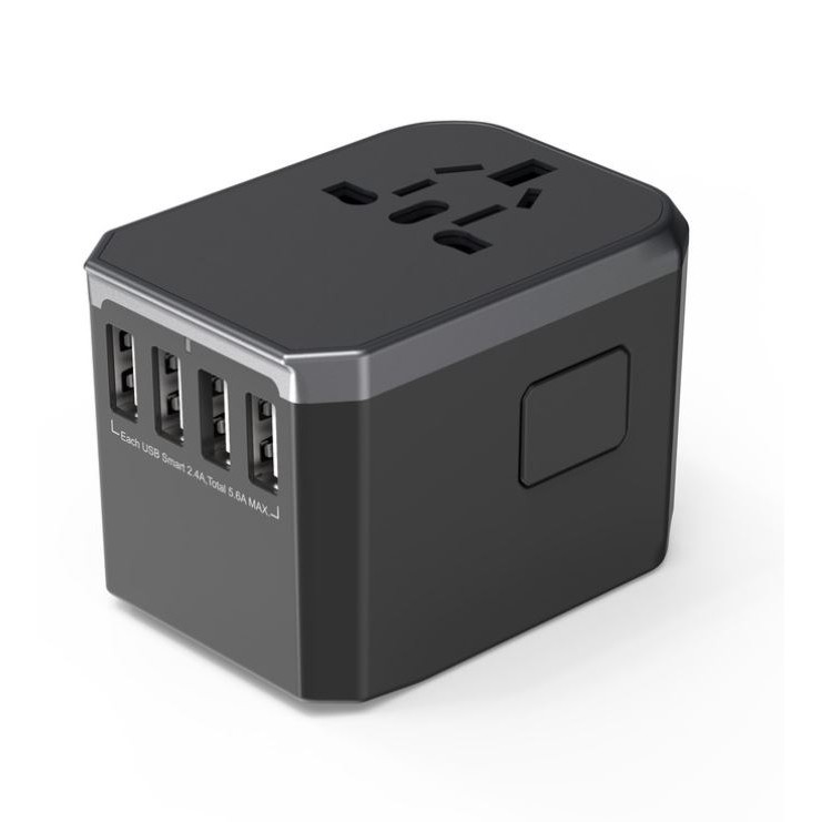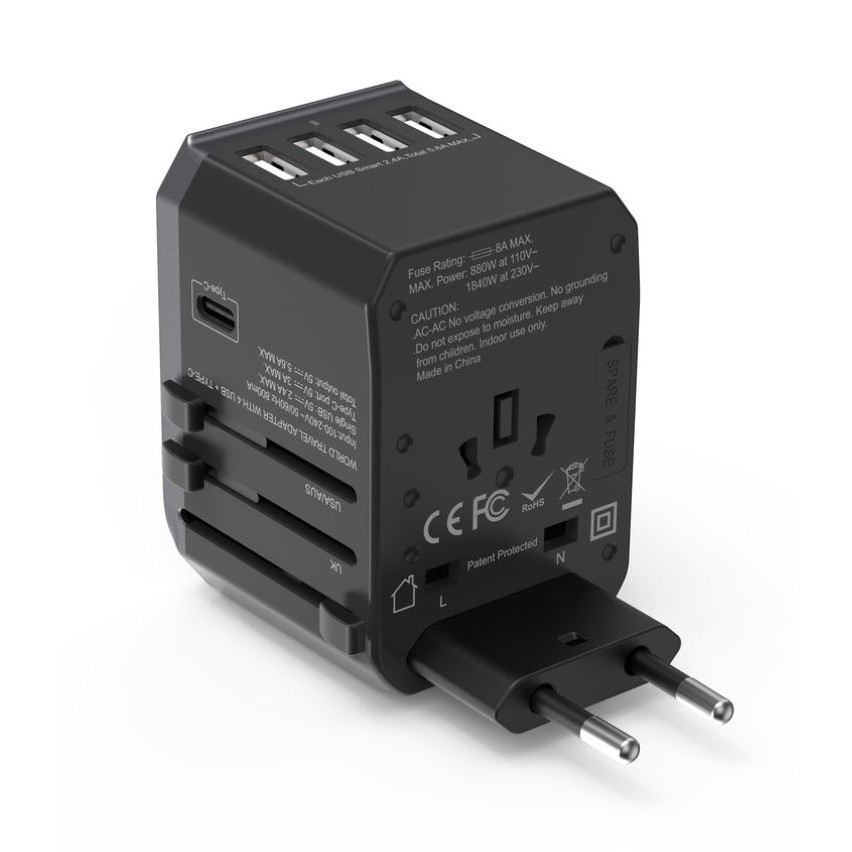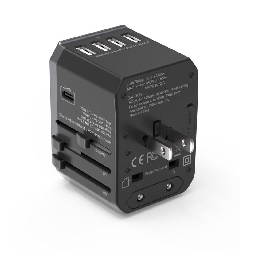 MAZER ENERG TRAVEL USBX4/USB-CX1/AC SocketX1 Worlwide Adapter/100-240A/8A Spare Fuse-GREY