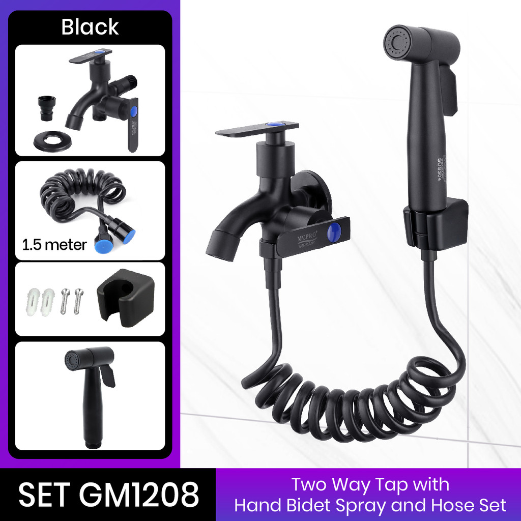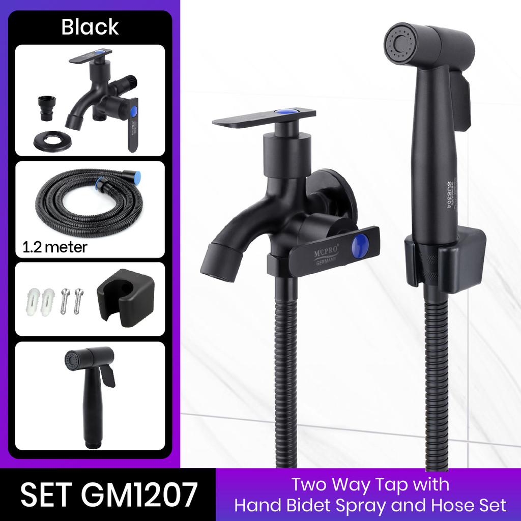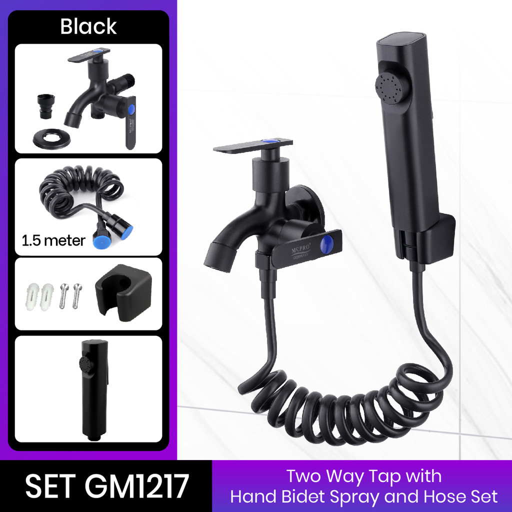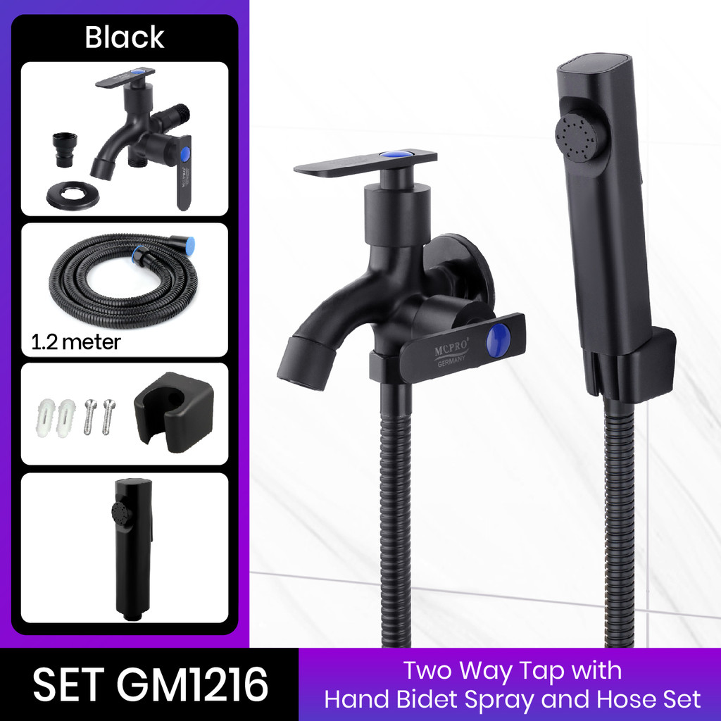 MCPRO Alloy Steel BLACK Two Way Tap with Hand Spray Bidet & Nozzle Adapter for Washing Machine (SET MAA835B)
