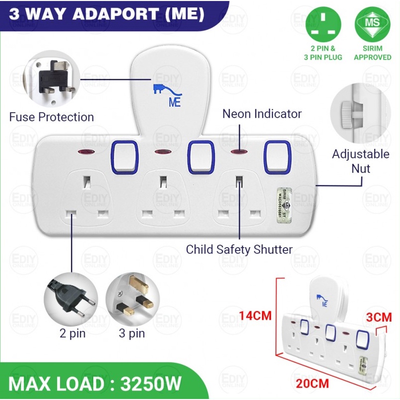 ME Wall Extension Plug Socket T-Adaport Extantion Multiple Wall Socket Power Socket Gantung Dinding Sirim