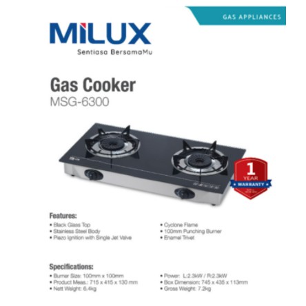 MILUX MSG-6300 2 BURNERS DAPUR GAS ATAS KACA HITAM BLACK GLASS TOP GAS COOOKER