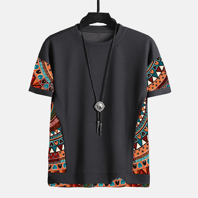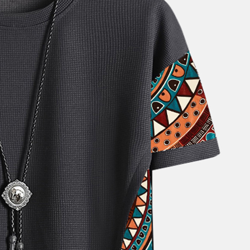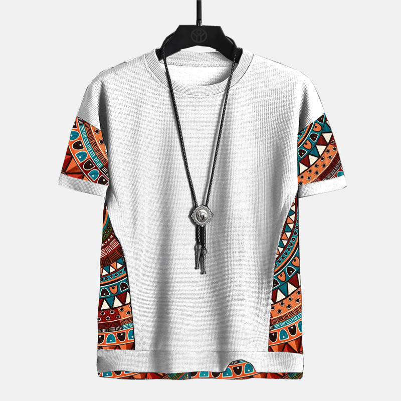 MR Men's Ethnic Geometric Pattern Stitching Texture Short Sleeve Streetwear T-Shirts
