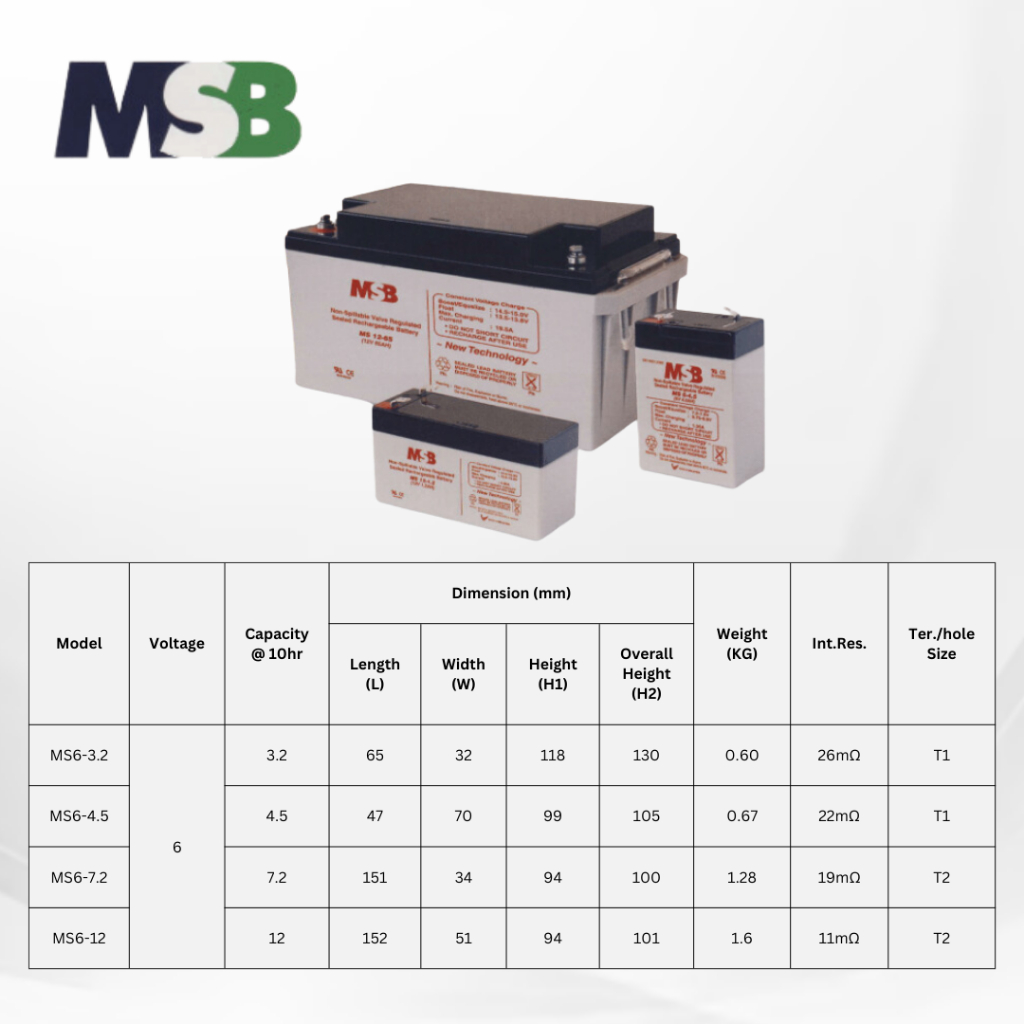 MSB 6V MAINTENANCE FREE VRLA SLA BATTERY 3.2AH 4.5AH 7.2AH 12AH