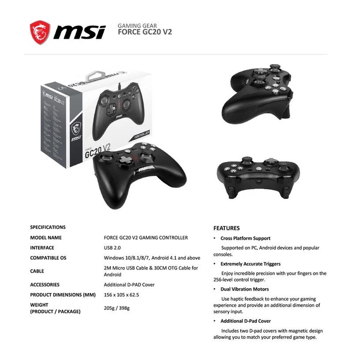 MSI Force GC20 V2 Wired Gaming Controller, PC USB GamePad [Compatible with Windows & Android]
