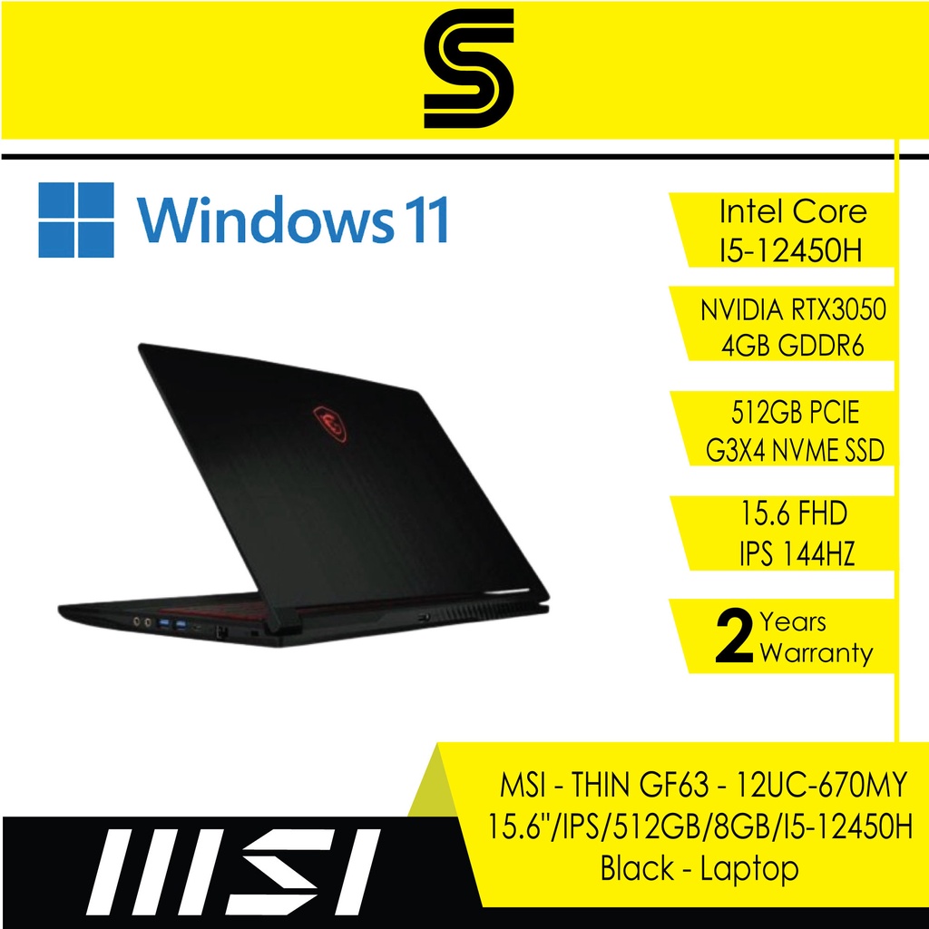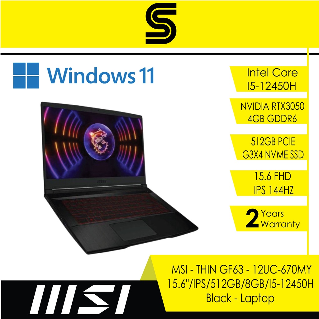 MSI GF63 Thin 12UC 670 (15.6 Inch FHD IPS 144Hz|Intel I5-12450H|8GB|512GB SSD|Nvidia RTX3050|Win 11| 2Y Warranty)