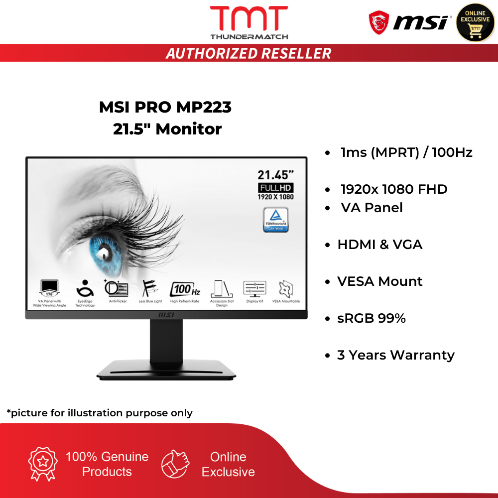 MSI PRO MP223 21.5" Monitor | 1ms (MPRT) | 100Hz | 1920x 1080 FHD | Flat | VA Panel | VESA | HDMI & VGA | 99% sRGB | 3Y Warranty