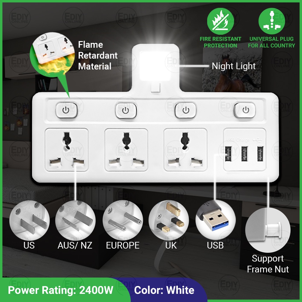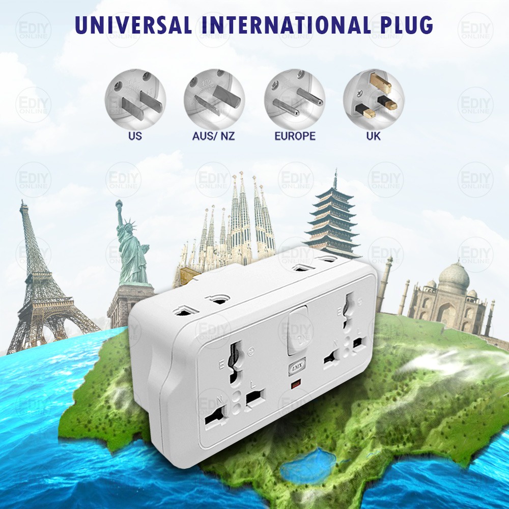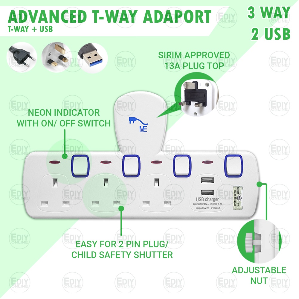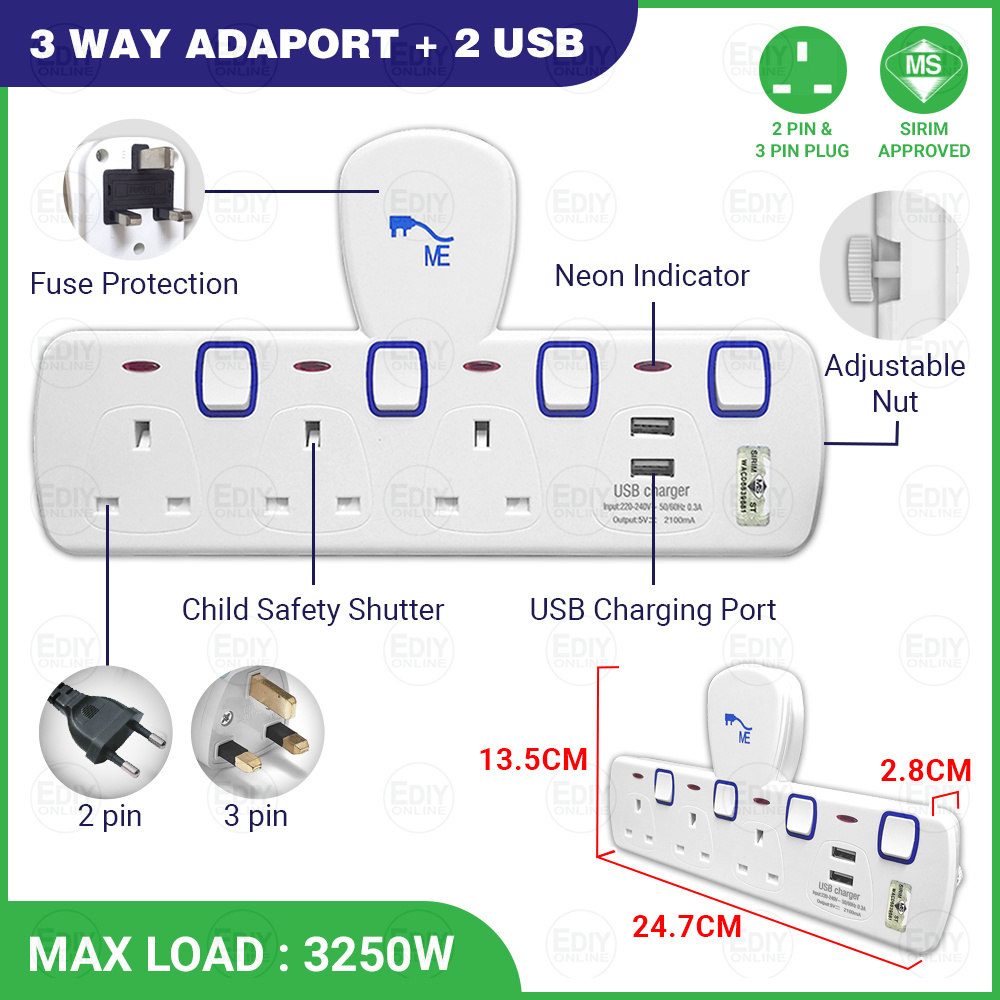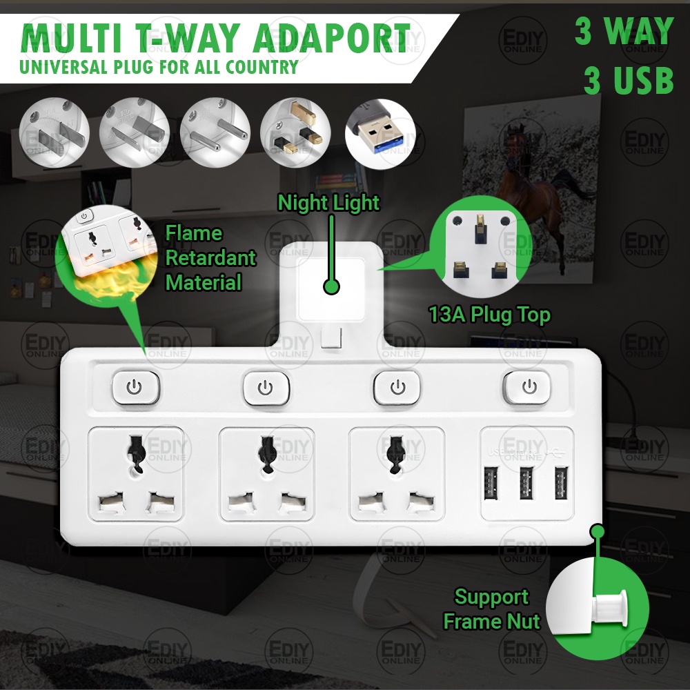 Universal Outlet Adaport T Way Multi Adaptor 3 pin USB Wall Extension Plug Trailing Socket Extension Adapter Soket