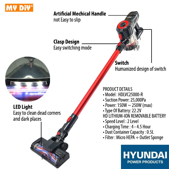 MYDIYSDNBHD - HYUNDAI CORDLESS VACUUM CLEANER CYCLONE 25000PA / HDVC28000 HYUNDAI 2 IN 1 HANDHELD VACUUM CLEANER